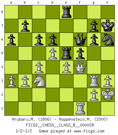 Last move : 1/2-1/2 2007 November 15 17:16:53 [Event "FICGS__CHESS__CLASS_B__000028"] [Site "FICGS"] [Date "2007.09.10"] [Round "1"] [White "Hrubaru,Mircea"] [Black "Hoppenstein,Michael"] [Result "1/2-1/2"] [WhiteElo "1806"] [BlackElo "2000"] 1.e4 Nf6 2.e5 Nd5 3.c4 Nb6 4.d4 d6 5.exd6 exd6 6.Nc3 Be7 7.Bd3 O-O 8.Nge2 Bg4 9.b3 Nc6 10.Be3 Bg5 11.O-O Bxe3 12.fxe3 Qe7 13.Qd2 Rae8 14.Be4 f5 15.Bd5+ Nxd5 16.Nxd5 Qd8 17.Nec3 a6 18.Rf2 Qd7 19.Raf1 Bh5 20.Qd3 Bg6 21.a3 Na5 22.Ne2 Nc6 23.Ndf4 Rf6 24.Nxg6 hxg6 25.Nc3 Nd8 26.h3 Nf7 27.e4 Nh6 28.Qg3 c6 29.Kh2 Qc7 30.Rf3 Kh7 31.Re1 Rfe6 32.Qf4 Qd8 33.Rg3 Qf6 34.d5 Re5 35.Rf1 1/2-1/2 Alekhine's defense Kingside Castling by player Black (move 7) Kingside Castling by player White (move 11) This chess game ended in a draw. Follow this game move after move (download)A man that will take back a move at Chess will pick a pocket. (Richard Fenton) Die Leute spielen gegen mich seit 15 Jahren unter Ihren Möglichkeiten. (Robert James Fischer) En el tablero, la mentira e hipocresía no sobreviven mucho. (Emanuel Lasker) Le moment que je préfère le plus dans une rencontre, c'est celui où je sens que la personnalité de l'adversaire se brise. (Robert Fischer) I would love to change the world, but they won't give me the source code. (Unknown)