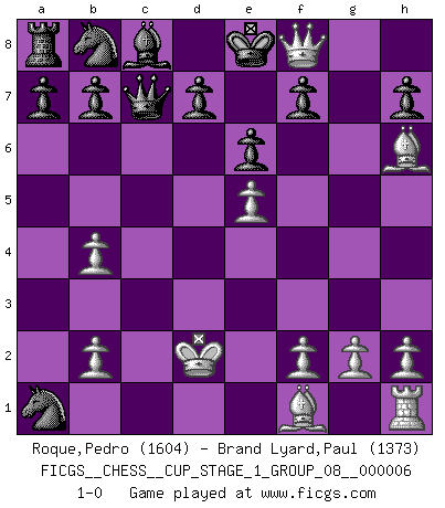 Last move : 1-0 2023 December 5 19:29:7 [Event "FICGS__CHESS__CUP_STAGE_1_GROUP_08__000006"] [Site "FICGS"] [Date "2023.11.17"] [Round "1"] [White "Roque,Pedro"] [Black "Brand Lyard,Paul"] [Result "1-0"] [WhiteElo "1604"] [BlackElo "1373"] 1.e4 c5 2.Nf3 e6 3.d4 cxd4 4.Nxd4 Nf6 5.Nc3 Bb4 6.e5 Ne4 7.Qg4 Nxc3 8.Qxg7 Rf8 9.a3 Nb5 10.axb4 Nxd4 11.Bg5 Qc7 12.Bh6 Nxc2+ 13.Kd2 Nxa1 14.Qxf8+ 1-0 Follow this game move after move (download)The sign of a great Master is his ability to win a won game quickly and painlessly. (Irving Chernev) Der 70jährige Viktor Kortschnoi: Die Rentenanstalt wollte mich zwingen in Rente zu gehen. Meine Frau erhält jetzt eine Pension- und ich zahle weiter in die Rentenkasse ein! (Viktor Kortschnoi) Todo lo que importa ante el tablero de Ajedrez son buenas jugadas. (Bobby Fischer) Pour moi, les échecs ne sont pas un jeu mais un art. (Alexandre Alekhine) Difficult things take a long time, impossible things a little longer. (Author unknown)