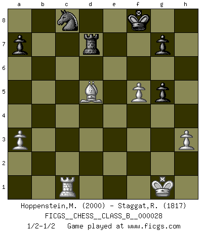 Last move : 1/2-1/2 2008 January 6 20:45:40 [Event "FICGS__CHESS__CLASS_B__000028"] [Site "FICGS"] [Date "2007.09.10"] [Round "1"] [White "Hoppenstein,Michael"] [Black "Staggat,Rolf"] [Result "1/2-1/2"] [WhiteElo "2000"] [BlackElo "1817"] 1.d4 Nf6 2.c4 e6 3.Nc3 Bb4 4.Qc2 O-O 5.a3 Bxc3+ 6.Qxc3 b6 7.Nf3 Bb7 8.g3 c5 9.dxc5 bxc5 10.Bg2 Ne4 11.Qd3 d5 12.O-O Nd7 13.Bf4 Qb6 14.b4 Rfd8 15.cxd5 Bxd5 16.Ne5 Nef6 17.Nxd7 Rxd7 18.bxc5 Qxc5 19.Rfc1 Qe7 20.f3 e5 21.Be3 Qe6 22.Qc3 Ne8 23.Rd1 f5 24.Rac1 Rad8 25.Bh3 Nd6 26.Bg5 Rc8 27.Qb4 e4 28.Rxc8+ Nxc8 29.g4 exf3 30.exf3 h6 31.gxf5 Qe2 32.Qd2 Qxf3 33.Bg2 Qg4 34.h3 Qxg5 35.Qxg5 hxg5 36.Bxd5+ Kf8 37.Rc1 1/2-1/2 Nimzo-Indian : Classical variation Kingside Castling by player Black (move 4) Kingside Castling by player White (move 12) This chess game ended in a draw. Follow this game move after move (download)We must make sure that Chess will not be like a dead language, very interesting, but for a very small group. (Sytze Faber) Modernes Schach erfordert enorme Anspannung. Es ist für einen normalen Menschen unmöglich das auszuhalten. (Viktor Kortschnoi) Con el tiempo, empecé a progresar en partidas decisivas. Tal vez porque me di cuenta de una simple verdad: no solo estaba yo nervioso sino también mi oponente. (Mikhail Tal) Demandez au pauvre Cg1 ce qu'il en pense. Eduard Gufeld à propos de la variante Saemisch de l'Est-Indienne. As a goal marker shodan is important. As a destination it is a poor place to stop. (Thomas Tamayo)