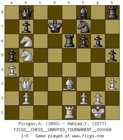 Last move : 1-0 2024 March 24 20:50:15 [Event "FICGS__CHESS__UNRATED_TOURNAMENT__000068"] [Site "FICGS"] [Date "2023.11.22"] [Round "1"] [White "Pirogov,Andrey Mikhaylovich"] [Black "Aahlad,Yeturu"] [Result "1-0"] [WhiteElo "1800"] [BlackElo "2277"] 1.Nf3 d5 2.d4 Bg4 3.Ne5 h5 4.c4 dxc4 5.h3 Be6 6.e4 c6 7.a4 a5 8.Nc3 f6 9.Nxc4 Nd7 10.Qb3 Qc7 11.d5 cxd5 12.exd5 Bf5 13.Nb5 Qb8 14.Be3 Nh6 15.Rd1 Nf7 16.Bd3 Bxd3 17.Rxd3 Ra6 18.O-O g6 19.Re1 e5 20.dxe6 Rxe6 21.Rxd7 Kxd7 22.Nb6+ 1-0 Follow this game move after move (download)White lost because he failed to remember the right continuation and had to think up the moves himself. (Siegbert Tarrasch) Wenn du nicht weißt was du tun sollst, warte bis dein Gegner eine Idee hat. Sie wird sicher schlecht sein. (Siegbert Tarrasch) El Ajedrez es un invernadero donde los frutos del carácter pueden madurar mas completamente que en la vida. (Edward Morgan Foster) Echiquier : carré parfait, comme la Jérusalem nouvelle décrite par l'auteur de l'Apocalypse, huit cases sur huit, exaltation du chiffre 4, symbole du cosmos aux quatre horizons... où le noir et le blanc, l'ombre et la lumière, le mal et le bien s'entremêlent et se conjuguent. (Robert Couffignal, Le Gambit du poète) Panic is a sudden desertion of us, an a going over to the enemy of our imagination. (Christian Nevell Bovee)