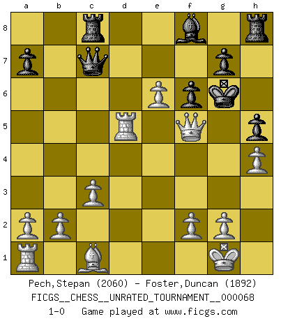 Last move : 1-0 2024 June 6 18:32:24 [Event "FICGS__CHESS__UNRATED_TOURNAMENT__000068"] [Site "FICGS"] [Date "2023.11.22"] [Round "1"] [White "Pech,Stepan"] [Black "Foster,Duncan"] [Result "1-0"] [WhiteElo "2060"] [BlackElo "1892"] 1.e4 c6 2.d4 d5 3.Nc3 dxe4 4.Nxe4 Bf5 5.Ng3 Bg6 6.h4 h6 7.Nf3 Nf6 8.Ne5 Bh7 9.Bd3 Bxd3 10.Qxd3 Nd5 11.Qf3 Nf6 12.Qb3 e6 13.Qxb7 Nbd7 14.c3 Nxe5 15.dxe5 Nd5 16.Qxc6+ Ke7 17.O-O Rc8 18.Qa6 Qc7 19.Rd1 f6 20.Nf5+ exf5 21.Rxd5 Kf7 22.e6+ Kg6 23.Qd3 h5 24.Qxf5+ 1-0 Follow this game move after move (download)Alekhine is a poet who creates a work of art out of something that would hardly inspire another man to send home a picture post card. (Max Euwe) Um dein Spiel zu verbessern musst du zuallererst das Endspiel studieren, denn diese kann unabhängig studiert werden. Die Eröffnung und das Mittelspiel müssen immer in Bezug gesetzt werden zum Endspiel. (José Raúl Capablanca) No todos los artistas son jugadores de Ajedrez, pero todos los jugadores de Ajedrez son artistas. (Marcel Duchamp) La tactique est l'élément le plus important du milieu de jeu. (Siegbert Tarrasch) I don't know, I don't care, and it doesn't make any difference. (Albert Einstein)