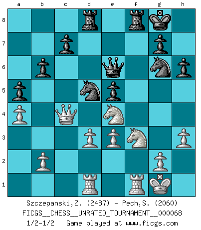 Last move : 1/2-1/2 2024 April 9 4:22:41 [Event "FICGS__CHESS__UNRATED_TOURNAMENT__000068"] [Site "FICGS"] [Date "2023.11.22"] [Round "1"] [White "Szczepanski,Zbigniew"] [Black "Pech,Stepan"] [Result "1/2-1/2"] [WhiteElo "2487"] [BlackElo "2060"] 1.e4 e5 2.Nf3 Nc6 3.Bc4 Nf6 4.d3 Bc5 5.c3 d6 6.Nbd2 a5 7.O-O O-O 8.h3 h6 9.a4 Be6 10.Bxe6 fxe6 11.Nc4 b6 12.Be3 Qe8 13.Qb3 Bxe3 14.fxe3 Ne7 15.Ncd2 Ng6 16.Qb5 Qe7 17.Rad1 d5 18.c4 Rad8 19.exd5 exd5 20.cxd5 Nxd5 21.Qc4 Qe6 22.Ne4 1/2-1/2 Follow this game move after move (download)During a Chess competition a Chessmaster should be a combination of a beast of prey and a monk. (Alexander Alekhine) Ich verstehe den Grund nicht, warum die Aufteilung in Frauen und Männer überhaupt im Schach besteht. (Judith Polgar) No existe un remordimiento como el remordimiento del Ajedrez. (H. G. Wells) Les sacrifices démontrent seulement que quelqu'un a gaffé. (Savielly Tartacover) The human is the only animal species whose members are able to talk themselves into difficulties that would not otherwise exist. (Wendell Johnson)