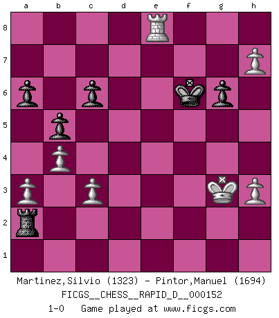 Last move : 1-0 2024 January 27 1:14:4 [Event "FICGS__CHESS__RAPID_D__000152"] [Site "FICGS"] [Date "2023.11.23"] [Round "1"] [White "Martinez,Silvio"] [Black "Pintor,Manuel"] [Result "1-0"] [WhiteElo "1323"] [BlackElo "1694"] 1.e4 e5 2.Nf3 Nc6 3.Nc3 Bc5 4.a3 a6 5.b3 d6 6.d4 Nxd4 7.b4 Ba7 8.Be3 Bg4 9.Be2 Nxe2 10.Qxe2 Bxe3 11.Qxe3 Nf6 12.O-O O-O 13.h3 Be6 14.Rfe1 c6 15.Rad1 Qc7 16.Ng5 Bd7 17.Ne2 h6 18.Nf3 Nh5 19.c3 f5 20.exf5 Bxf5 21.Nh4 Nf4 22.Nxf4 exf4 23.Qxf4 Be6 24.Qxd6 Qxd6 25.Rxd6 Bd5 26.Re7 Rf7 27.Rxf7 Bxf7 28.Nf5 Rb8 29.g4 Re8 30.Kg2 Bd5+ 31.Kg3 Re1 32.Rd7 b5 33.Kf4 Rf1 34.Ne7+ Kh7 35.Nxd5 Rxf2+ 36.Kg3 Rc2 37.Nf6+ Kg6 38.Ne4 Re2 39.Rd4 Ra2 40.Rd6+ Kh7 41.g5 g6 42.Nf6+ Kg7 43.Rd7+ Kf8 44.Rd8+ Ke7 45.Re8+ Kf7 46.gxh6 Kxf6 47.h7 1-0 Follow this game move after move (download)The older I grow, the more I value pawns. (Paul Keres) Auf jeden Fall musst du zuerst Rechtsanwalt werden, damit du deine eigenen Interessen und die deiner Familie vertreten kannst. [Brief an seinen Sohn] (José Raúl Capablanca) Fischer es el jugador mas fuerte del mundo. De hecho, el jugador mas fuerte que jamas haya existido. (Larry Evans) Si rien de grave n'est détecté lors de l'analyse d'une position, on joue alors le coup. Seconde règle de Blumenfeld. Luck is what you have left over after you give 100 percent. (Langston Coleman)