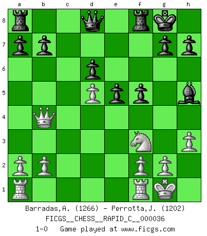 Last move : 1-0 2007 December 1 20:3:37 [Event "FICGS__CHESS__RAPID_C__000036"] [Site "FICGS"] [Date "2007.09.10"] [Round "1"] [White "Barradas,Anderson"] [Black "Perrotta,John Zach"] [Result "1-0"] [WhiteElo "1266"] [BlackElo "1202"] 1.e4 c5 2.Nf3 Nc6 3.d4 cxd4 4.Nxd4 Nf6 5.Nc3 e5 6.Nf3 Bc5 7.Bg5 O-O 8.Nd5 Be7 9.Bc4 Nxe4 10.Bxe7 Nxe7 11.Qe2 Nxd5 12.Bxd5 Nf6 13.c4 d6 14.O-O Nxd5 15.cxd5 Bg4 16.h3 Bh5 17.Qe4 f5 18.Qb4 1-0 This chess game has been lost on time (started : 2007.09.10 23:59:11) Sicilian : Pelikan (Lasker/Sveshnikov) variation Kingside Castling by player Black (move 7) Kingside Castling by player White (move 14) Player White won this chess game. Follow this game move after move (download)Bobby Fischer is the greatest Chess genius of all time ! (Alexander Kotov) Ich hatte Zahnschmerzen im ersten Spiel. In der zweiten Partie tat mir der Kopf weh. In der dritten war es eine Rheuma-Attacke und während der vierten fühlte ich mich nicht gut. Und in der fünften? Nun, man muss doch nicht jedes Spiel gewinnen, oder? (Savielly Grigorievitsch Tartakower) La vida es como el Ajedrez, con lucha, competición y eventos buenos y malos. (Benjamin Franklin) Les Echecs représentent une sphère d'idées créatrices basée sur la volonté des deux protagonistes. (Smyslov) There are more things in heaven and earth than practically anywhere else. (Unknown)