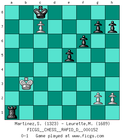Last move : 0-1 2024 February 18 2:18:46 [Event "FICGS__CHESS__RAPID_D__000152"] [Site "FICGS"] [Date "2023.11.23"] [Round "1"] [White "Martinez,Silvio"] [Black "Leurette,Marc-Antoine"] [Result "0-1"] [WhiteElo "1323"] [BlackElo "1689"] 1.e4 e5 2.Nf3 Nc6 3.d4 exd4 4.Nxd4 Bc5 5.Nxc6 bxc6 6.Nc3 d6 7.Bf4 Nf6 8.a3 O-O 9.e5 dxe5 10.Be3 Bxe3 11.fxe3 Nd5 12.Bc4 Nxc3 13.bxc3 a5 14.O-O Qe7 15.Kh1 Ba6 16.Bxa6 Rxa6 17.Qd3 R6a8 18.Qc4 c5 19.Rad1 Rad8 20.Qb5 Ra8 21.Rd5 c6 22.Qxc5 Qxc5 23.Rxc5 f6 24.Rxc6 Rac8 25.Rxc8 Rxc8 26.Rd1 Rxc3 27.Kg1 Rxe3 28.a4 Rc3 29.Rc1 Rc4 30.Kf2 Rxa4 31.c4 Kf8 32.c5 Ke8 33.c6 Kd8 34.c7+ Kc8 35.Ke3 Rb4 36.Rc5 a4 37.Kd3 a3 38.Kc3 Ra4 39.Kb3 a2 40.Rc1 a1Q 41.Rxa1 Rxa1 0-1 This chess game has been lost on time (started : 2023.11.23 1:20:51) Follow this game move after move (download)After a bad opening, there is hope for the middle game. After a bad middle game, there is hope for the endgame. But once you are in the endgame, the moment of truth has arrived. (Edmar Mednis) Die westlichen Werte sind eine Sprache, welche die Putin-Administration nicht versteht. (Garry Kasparov) Sin errores no puede haber brillantez. (Emanuel Lasker) Les erreurs sont comme les malheurs, elles n'arrivent jamais seules. (Siegbert Tarrasch) Don't be irreplaceable, if you can't be replaced, you can't be promoted. (Dan Rotaru)