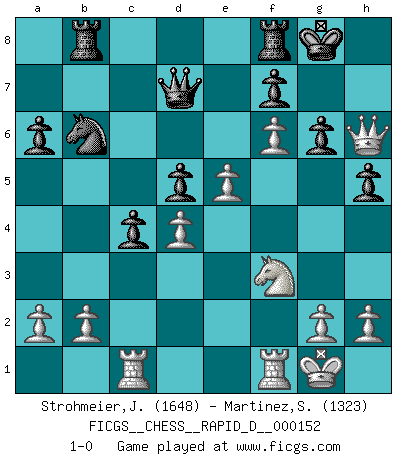 Last move : 1-0 2024 February 25 21:37:29 [Event "FICGS__CHESS__RAPID_D__000152"] [Site "FICGS"] [Date "2023.11.23"] [Round "1"] [White "Strohmeier,Josef"] [Black "Martinez,Silvio"] [Result "1-0"] [WhiteElo "1648"] [BlackElo "1323"] 1.e4 e5 2.Nf3 Nc6 3.Bb5 Nf6 4.O-O a6 5.Ba4 d5 6.Nxe5 Bd7 7.Nxc6 Bxc6 8.Bxc6+ bxc6 9.e5 Nd7 10.d4 Be7 11.f4 O-O 12.f5 c5 13.c3 c4 14.Nd2 Bg5 15.Nf3 Bxc1 16.Rxc1 c5 17.Qe1 cxd4 18.cxd4 Nb6 19.Qg3 Rb8 20.f6 g6 21.Qh4 h5 22.Qg5 Qd7 23.Qh6 1-0 Follow this game move after move (download)I won't play with you anymore. You have insulted my friend. - When an opponent cursed himself for a blunder. (Miguel Najdorf) Warum muß ich gegen diesen IDIOTEN verlieren? (Aaron Nimzowitsch) Si tu oponente te ofrece un empate, trata de averiguar porque piensa él que esta en una posición peor. (Nigel Short) Même si vous avez un bon coup à faire, regardez toujours s'il n'y en a pas un qui lui soit préférable. (Pedro Damiano) The best teachers teach from the heart, not from the book. (Author unknown)