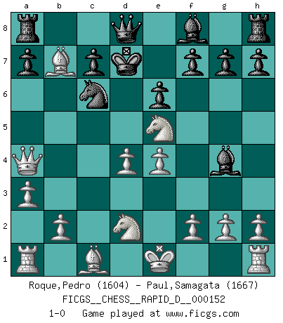 Last move : 1-0 2023 November 29 2:52:10 [Event "FICGS__CHESS__RAPID_D__000152"] [Site "FICGS"] [Date "2023.11.23"] [Round "1"] [White "Roque,Pedro"] [Black "Paul,Samagata"] [Result "1-0"] [WhiteElo "1604"] [BlackElo "1667"] 1.d4 d5 2.c4 Nf6 3.cxd5 Nxd5 4.Nf3 Bf5 5.Nbd2 Nb4 6.e4 Bg4 7.Qa4+ N8c6 8.a3 Na6 9.Bxa6 e6 10.Bxb7 Kd7 11.Ne5+ 1-0 Follow this game move after move (download)It began to feel as though you were playing against Chess itself. - On playing against Robert Fischer. (Walter Shipman) Um sich vor der Gefahr einer Erkältung zu schützen, sorge der wanderlustige König beizeiten für ein brauchbares Versteck. (Aaron Nimzowitsch) El ganador de una partida es aquel jugador que hace el penúltimo error. (Savielly Tartakover) Le système Elo représente seulement une moyenne. Il est simplement un indicateur de votre stabilité. (Anatoli Karpov) Strategy without tactics is the slowest route to victory. Tactics without strategy is the noise before defeat. (Sun Tzu)