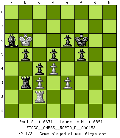 Last move : 1/2-1/2 2023 December 9 15:40:24 [Event "FICGS__CHESS__RAPID_D__000152"] [Site "FICGS"] [Date "2023.11.23"] [Round "1"] [White "Paul,Samagata"] [Black "Leurette,Marc-Antoine"] [Result "1/2-1/2"] [WhiteElo "1667"] [BlackElo "1689"] 1.d4 d5 2.Nf3 e6 3.a3 Nf6 4.Nc3 b6 5.e3 c5 6.Ne5 c4 7.Be2 Bd6 8.f4 a6 9.O-O O-O 10.Bd2 b5 11.b4 Bd7 12.g4 Nc6 13.g5 Ne4 14.Kh1 Nxd2 15.Qxd2 Ne7 16.Bg4 a5 17.Ne2 g6 18.h4 h5 19.gxh6 Nc6 20.c3 Qxh4+ 21.Kg2 Nxe5 22.fxe5 Qxg4+ 23.Ng3 Be7 24.Rf4 Qg5 25.Rh1 f5 26.h7+ Kh8 27.Kf3 Bd8 28.Rh3 Qe7 29.Qg2 Rf7 30.Nh5 Qg5 31.Nf6 Qxg2+ 32.Kxg2 Bxf6 33.exf6 Rxf6 34.Kg3 Rf7 35.Rh6 Rxh7 36.Rxg6 Rg8 37.Rxg8+ Kxg8 38.bxa5 Bc8 39.Rh4 Rg7+ 40.Kf4 Rg1 41.Rh3 Ra1 42.Rh2 Rxa3 43.Rc2 Rxa5 44.Ke5 Kf7 45.Kd6 Ra3 46.Kc7 Ba6 47.Kc6 Kf6 48.Kc5 Rb3 49.Kb6 Bc8 50.Kc7 Ba6 51.Kb6 Ra3 52.Kc5 Rb3 53.Kb6 1/2-1/2 Follow this game move after move (download)Many have become Chess Masters, no one has become the Master of Chess. (Siegbert Tarrasch) Wie kann ich Remis annehmen? Ich weiß ja gar nicht, wie ich stehe! (Fritz Sämisch) No soy una persona materialista y por eso, no resiento la falta o pérdida del dinero. La ausencia de cosas mundanas carece de importancia. Ya que el Ajedrez es una forma en la que puedo ser tan materialista como yo desee sin tener la necesidad de vender mi alma. (Jamie Walter Adams) Il vaut toujours mieux jouer un plan faux de façon logique que de n'avoir pas de plan du tout. (Victor Kortchnoï) The question of whether computers can think is just like question of whether submarines can swim. (Edsger W. Dijkstra)