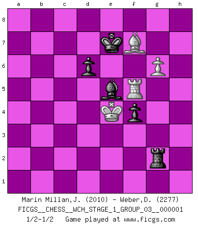 Last move : 1/2-1/2 2006 October 13 7:3:39 [Event "FICGS__CHESS__WCH_STAGE_1_GROUP_03__000001"] [Site "FICGS"] [Date "2006.07.01"] [Round "1"] [White "Marin Millan,Jose Antonio"] [Black "Weber,Daniel"] [Result "1/2-1/2"] [WhiteElo "2010"] [BlackElo "2277"] 1.e4 c5 2.Nf3 d6 3.d4 cxd4 4.Nxd4 Nf6 5.Nc3 a6 6.Bg5 e6 7.f4 Qc7 8.Bxf6 gxf6 9.Qd2 b5 10.Bd3 Bb7 11.f5 Nc6 12.Nxc6 Qxc6 13.Qf4 Ke7 14.fxe6 fxe6 15.Rf1 Bg7 16.Ne2 Qc5 17.c3 h5 18.Qf2 Rag8 19.Nd4 Rc8 20.a3 Rhf8 21.Qe2 Bh6 22.Rd1 Qe5 23.g3 Rg8 24.Nf3 Qc5 25.Bb1 Qe3 26.Qxe3 Bxe3 27.Nh4 Bg5 28.Nf3 h4 29.Kf2 hxg3+ 30.hxg3 Bh6 31.Nd4 Rg4 32.Ba2 Rh8 33.Rfe1 Rxe4 34.Rxe4 Bxe4 35.Nxe6 f5 36.Ke2 a5 37.Rf1 b4 38.cxb4 axb4 39.axb4 Ra8 40.Bc4 Rc8 41.Bb3 Rb8 42.Nc7 Rxb4 43.Nd5+ Bxd5 44.Bxd5 Rxb2+ 45.Kd3 Kf6 46.g4 Rd2+ 47.Kc4 f4 48.Rh1 Bg7 49.Rh5 Ke7 50.Rf5 Be5 51.Bf7 Rd1 52.g5 Kd7 53.g6 Rg1 54.Kd3 Kd8 55.Ke4 Ke7 56.Kd5 Rg2 57.Ke4 1/2-1/2 Sicilian : Najdorf, 7.f4 10 pieces endgame at move 44 : White KRBPP , Black KRBPP WHITE : King + 1 Rook 1 Bishop 2 Pawns BLACK : King + 1 Rook 1 Bishop 2 Pawns 9 pieces endgame at move 44 : White KRBP , Black KRBPP WHITE : King + 1 Rook 1 Bishop 1 Pawn BLACK : King + 1 Rook 1 Bishop 2 Pawns This chess game ended in a draw. Follow this game move after move (download)It's always better to sacrifice your opponent's men. (Savielly Tartakover) Mutter, ich bin eben Ex-Weltmeister geworden. --beim nach Hause Kommen nach dem Verlust des WM-Titels an Mihail Botvinnik -- (Mikhail Nekhemyevich Tal) Hay dos clases de hombres: aquellos que se conforman en dejarse llevar por las circunstancias y que juegan barajas y aquellos decididos a controlar las circunstancias y que juegan al Ajedrez. (Mortimer Collins) Un footballeur joue avec ses pieds, parfois avec sa tête. Un joueur d'échecs ne joue qu'avec sa tête. Et quand il ne joue plus, il meurt. (Jacob Murray) Only sick music makes money today. (Friedrich Nietzsche)