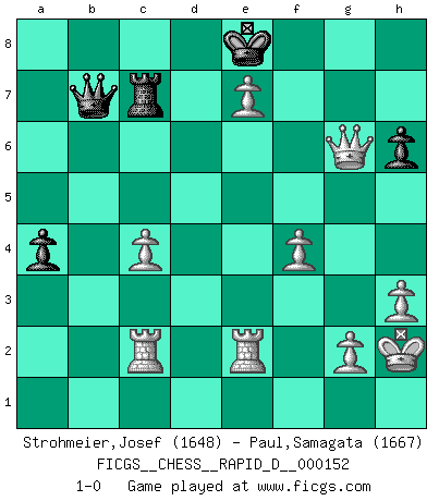 Last move : 1-0 2024 February 3 2:18:2 [Event "FICGS__CHESS__RAPID_D__000152"] [Site "FICGS"] [Date "2023.11.23"] [Round "1"] [White "Strohmeier,Josef"] [Black "Paul,Samagata"] [Result "1-0"] [WhiteElo "1648"] [BlackElo "1667"] 1.e4 e5 2.Nf3 Nc6 3.Bb5 d6 4.d4 Bd7 5.O-O h6 6.Nc3 a6 7.Ba4 Nf6 8.h3 b5 9.Bb3 Na5 10.dxe5 dxe5 11.Nxe5 Nxb3 12.axb3 Bd6 13.Nxd7 Nxd7 14.Qg4 Qf6 15.Nd5 Qe5 16.Bf4 Qxb2 17.Bxd6 cxd6 18.Nc7+ Ke7 19.Nxa8 Rxa8 20.Qe2 Ne5 21.f4 Ng6 22.Rae1 Rc8 23.Rf2 Rc5 24.Rd1 a5 25.Qd3 d5 26.exd5 Kd6 27.R1d2 Ne7 28.c4 Qa1+ 29.Kh2 bxc4 30.bxc4 g6 31.Ra2 Qc1 32.Rac2 Qb1 33.Qd4 Nf5 34.Qf6+ Kd7 35.Qxf7+ Ne7 36.Qe6+ Ke8 37.d6 Qb7 38.Rfe2 a4 39.dxe7 Rc7 40.Qxg6+ 1-0 Follow this game move after move (download)Chess is a more highly symbolic game, but the aggressions are therefore even more frankly represented in the play. It probably began as a war game; that is, the representation of a miniature battle between the forces of two kingdoms. (Karl Meninger) Frage: Was machen Sie mit den Preisen? Anwort: Ich habe Angst, dass meine Freundin davon neue Kleider kauft. (Loek van Wely) Jugadores de primera clase pierden en contra de jugadores de segunda clase porque los jugadores de segunda clase a veces juegan una partida de primer clase. (Siegbert Tarrasch) Vouloir jouer aux échecs contre soi-même est aussi paradoxal que vouloir marcher sur son ombre. (Stefan Zweig) May I never be complete. May I never be content. May I never be perfect. Deliver me, Tyler, from being perfect and complete. (Chuck Palahniuk, Fight Club)
