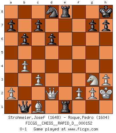 Last move : 0-1 2024 March 13 22:32:6 [Event "FICGS__CHESS__RAPID_D__000152"] [Site "FICGS"] [Date "2023.11.23"] [Round "1"] [White "Strohmeier,Josef"] [Black "Roque,Pedro"] [Result "0-1"] [WhiteElo "1648"] [BlackElo "1604"] 1.e4 e5 2.Nf3 Nc6 3.Bb5 Nf6 4.O-O Nxe4 5.Re1 Nd6 6.Bf1 f6 7.d4 Nf7 8.dxe5 fxe5 9.Bc4 d6 10.h3 Be7 11.Nc3 O-O 12.Nd5 Be6 13.c3 Qd7 14.Bb3 Rae8 15.Nxe7+ Qxe7 16.Be3 Bxb3 17.Qxb3 b6 18.Rad1 Qe6 19.Qb5 Nfd8 20.Ng5 Qg6 21.Qd5+ Kh8 22.b4 e4 23.Bc1 Rf5 24.Qd2 Ne5 25.Kh1 Nd3 26.Nxe4 Nxe1 27.Rxe1 Rfe5 28.Ng3 Rxe1+ 29.Kh2 Qb1 0-1 Follow this game move after move (download)All that matters on the Chessboard is good moves. (Bobby Fischer) Wer wird heute Abend ihr Gegner sein? -- Heute Abend spiele ich gegen die schwarzen Steine. (Akiba Rubinstein) Sin errores no puede haber brillantez. (Emanuel Lasker) Si le désir cupide (et stupide) de gagner est une inépuisable source de souffrance, une combinaison brillante sur l'échiquier est une découverte : le coquelicot qui s'épanouit lorsque apparaît la Voie Lactée. (Arrabal) Hold em is to stud what chess is to checkers. (Johnny Moss)