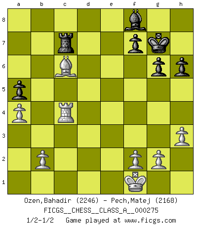 Last move : 1/2-1/2 2024 May 30 9:42:2 [Event "FICGS__CHESS__CLASS_A__000275"] [Site "FICGS"] [Date "2023.11.27"] [Round "1"] [White "Ozen,Bahadir"] [Black "Pech,Matej"] [Result "1/2-1/2"] [WhiteElo "2246"] [BlackElo "2168"] 1.d4 d5 2.Nf3 Nf6 3.c4 c6 4.Nc3 e6 5.Bg5 h6 6.Bxf6 Qxf6 7.e3 Nd7 8.Be2 Be7 9.O-O O-O 10.Rc1 g6 11.Nd2 Qg7 12.Qc2 a6 13.h3 Rd8 14.a4 e5 15.cxd5 exd4 16.exd4 Qxd4 17.Rfd1 Nc5 18.Nde4 Qe5 19.Nxc5 Bxc5 20.Qe4 Qg3 21.Qf3 Qxf3 22.Bxf3 Bd7 23.Ne4 Bf8 24.Nf6+ Kg7 25.Nxd7 Rxd7 26.dxc6 Rxd1+ 27.Rxd1 bxc6 28.Bxc6 Ra7 29.Rd4 Rc7 30.Rc4 a5 31.Kf1 1/2-1/2 Follow this game move after move (download)I look one move ahead... the best ! (Siegbert Tarrasch) Wer sich die Fähigkeit anerziehen will im Schach selbstständig zu denken, der muß alles meiden, was leblos ist: ausgeklügelte Theorien, die sich auf sehr wenige Beispiele und eine Menge Hirngespinste stützen. (Emanuel Lasker) No existe un remordimiento como el remordimiento del Ajedrez. (H. G. Wells) Aucun coup ne doit être joué sans but. (Pedro Damiano) Quotation,n.: The act of repeating erroneously the words of another. The words erroneously repeated. (Ambrose Bierce, The Devil's Dictionary)