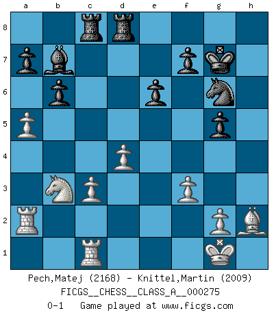 Last move : 0-1 2024 July 11 3:53:58 [Event "FICGS__CHESS__CLASS_A__000275"] [Site "FICGS"] [Date "2023.11.27"] [Round "1"] [White "Pech,Matej"] [Black "Knittel,Martin"] [Result "0-1"] [WhiteElo "2168"] [BlackElo "2009"] 1.d4 Nf6 2.c4 e6 3.Nc3 Bb4 4.e3 O-O 5.Bd3 d5 6.Nf3 dxc4 7.Bxc4 c5 8.O-O cxd4 9.exd4 b6 10.Bg5 Bb7 11.Qe2 Bxc3 12.bxc3 Nbd7 13.Nd2 Rc8 14.Rac1 Qc7 15.Rfe1 h6 16.Bh4 Qf4 17.Bg3 Qg5 18.h4 Qa5 19.Nb3 Qh5 20.Bb5 Qxe2 21.Rxe2 Rfd8 22.f3 Nh5 23.Bh2 Nf8 24.Bd3 g5 25.hxg5 hxg5 26.a4 Kg7 27.a5 Ng6 28.Ra2 Nhf4 29.Bxg6 Nxg6 0-1 Follow this game move after move (download)The older I grow, the more I value Pawns. (Keres) Die Jungen erwarten, dass Opa einfach umfällt. Dann aber kann Opa fünf Stunden lang Schach spielen und die jungen Gegner an die Wand drücken. (Viktor Kortschnoi) Estaba muy claro de que el punto vulnerable del Gran Maestro Americano (Bobby Fischer) radicaba en las posiciones de doble filo, colgantes, irracionales, donde el siempre falló en encontrar un triunfo aún en una posición de clara victoria. (Efim Geller) A ce moment-là, je menaçais de comprendre la position ! (Clément L'Heureux) Wawaweewa ! (Borat: Cultural learnings of America for make benefit glorious nation of Kazakhstan)