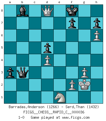 Last move : 1-0 2007 November 6 12:42:35 [Event "FICGS__CHESS__RAPID_C__000036"] [Site "FICGS"] [Date "2007.09.10"] [Round "1"] [White "Barradas,Anderson"] [Black "Serd,Than"] [Result "1-0"] [WhiteElo "1266"] [BlackElo "1432"] 1.e4 c6 2.d4 d5 3.exd5 cxd5 4.c4 e6 5.Nf3 Nf6 6.Bg5 Nc6 7.cxd5 exd5 8.Bb5 Be7 9.Qe2 O-O 10.O-O Re8 11.Bxc6 bxc6 12.Ne5 Bd6 13.Re1 Bd7 14.Nd2 Re6 15.Bxf6 gxf6 16.Qg4+ Kf8 17.Nxd7+ Qxd7 18.Qh5 Kg8 19.Rxe6 Qxe6 20.Nf3 Rb8 21.b3 Bb4 22.Kf1 Re8 23.a3 Qe2+ 24.Kg1 Bxa3 25.h4 Bd6 26.g3 Bb8 27.Kg2 Qb2 28.Qg4+ Kh8 29.Re1 Rxe1 30.Nxe1 Qxb3 31.Qc8+ Kg7 32.Qxc6 a5 33.h5 a4 34.h6+ Kf8 35.Qxf6 a3 36.Qd8+ 1-0 Caro-Kann : Panov-Botvinnik attack Kingside Castling by player Black (move 9) Kingside Castling by player White (move 10) Player White won this chess game. Follow this game move after move (download)The Pawns are the soul of the game. (Francois Andre Danican Philidor) Lisa Lane, amerikanische Schachmeisterin, hatte Fischer einmal als stärksten lebenden Spieler bezeichnet. Antwort: Das ist richtig, aber Lisa Lane ist eigentlich nicht in der Lage, das zu beurteilen. (Robert James Fischer) El Ajedrez es un terrible juego. Si no controlas el centro, tu oponente tiene una posición mas holgada. Si tienes control del centro, ¡entonces realmente tu tienes algo de que preocuparte!. (Siegbert Tarrasch) Psychologiquement, tu dois avoir confiance en toi même, mais cette confiance doit être basée sur des faits. (Robert Fischer) Faith : not wanting to know what is true. (Friedrich Nietzsche)