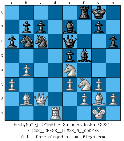 Last move : 0-1 2024 April 2 22:53:46 [Event "FICGS__CHESS__CLASS_A__000275"] [Site "FICGS"] [Date "2023.11.27"] [Round "1"] [White "Pech,Matej"] [Black "Salonen,Jukka"] [Result "0-1"] [WhiteElo "2168"] [BlackElo "2034"] 1.c4 e5 2.Nc3 Nf6 3.Nf3 Nc6 4.g3 d5 5.cxd5 Nxd5 6.Bg2 Nb6 7.O-O Be7 8.a3 O-O 9.d3 Bg4 10.b4 a6 11.Bb2 f6 12.Ne4 Qd7 13.Qc2 Rfd8 14.Rac1 Qe6 15.Rfd1 h6 16.d4 Bf5 17.dxe5 Rxd1+ 18.Rxd1 fxe5 19.e3 Rf8 0-1 Follow this game move after move (download)There must have been a time when men were demigods, or they could not have invented Chess. (Gustav Schenk) Der beste Spieler in einem Turnier gewinnt es nie. Er landet auf Platz zwei oder drei. (Siegbert Tarrasch) Una mala movida nulifica cuarenta buenas. (Horowitz) Que feriez-vous si vous étiez en train de jouer aux échecs et que la fin du monde arrive ? Je continuerais à jouer. (Saint Borromée) 98% of all statistics are made up. (Author unknown)