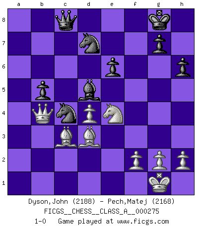 Last move : 1-0 2024 July 31 16:44:0 [Event "FICGS__CHESS__CLASS_A__000275"] [Site "FICGS"] [Date "2023.11.27"] [Round "1"] [White "Dyson,John"] [Black "Pech,Matej"] [Result "1-0"] [WhiteElo "2188"] [BlackElo "2168"] 1.d4 Nf6 2.c4 e6 3.Nf3 Bb4+ 4.Nbd2 b6 5.a3 Bxd2+ 6.Nxd2 Bb7 7.e3 d6 8.Nf3 O-O 9.Be2 c5 10.O-O Nbd7 11.b4 a5 12.Bb2 axb4 13.axb4 Rxa1 14.Bxa1 cxb4 15.Qd2 b3 16.Qc3 Ne4 17.Qxb3 d5 18.cxd5 Bxd5 19.Qb4 Qa8 20.Qb5 Qb7 21.Rc1 Rc8 22.Rxc8+ Qxc8 23.Bb2 h6 24.Bd3 Nd6 25.Qb4 Nc4 26.Bc3 f5 27.Nd2 b5 28.e4 fxe4 29.Nxe4 1-0 This chess game has been lost on time (started : 2023.11.27 18:15:0) Follow this game move after move (download)In a gambit you give up a Pawn for the sake of getting a lost game. (Samuel Standige Boden) Schach ist das Spiel, das die Verrückten gesund hält. (Albert Einstein) Juega la Apertura como un libro, el Juego Medio como un mago y los Finales como una máquina. (Spielmann) Demandez au pauvre Cg1 ce qu'il en pense. Eduard Gufeld à propos de la variante Saemisch de l'Est-Indienne. Life is like a game of cards: the hand you are dealt represents determinism; the way you play it is free will. (Jawaharlal Nehru)