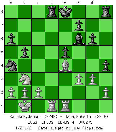Last move : 1/2-1/2 2024 January 13 7:50:7 [Event "FICGS__CHESS__CLASS_A__000275"] [Site "FICGS"] [Date "2023.11.27"] [Round "1"] [White "Swiatek,Janusz"] [Black "Ozen,Bahadir"] [Result "1/2-1/2"] [WhiteElo "2245"] [BlackElo "2246"] 1.e4 c5 2.Nf3 d6 3.d4 cxd4 4.Nxd4 Nf6 5.Nc3 a6 6.Be3 e5 7.Nb3 Be6 8.f3 h5 9.Nd5 Bxd5 10.exd5 g6 11.Qd2 Nbd7 12.O-O-O Nb6 13.Kb1 Nbxd5 14.Bg5 Be7 15.g3 Nb6 16.Bxf6 Bxf6 17.Qxd6 h4 18.Qxd8+ Rxd8 19.Bd3 Na4 20.Be4 b5 21.Rhe1 1/2-1/2 Follow this game move after move (download)Capture of the adverse King is the ultimate but not the first object of the game. (William Steinitz) Taktik ist was man tun muß, wenn etwas zu tun ist. Strategie ist was man tun muß, wenn nichts zu tun ist. (Savielly Grigorievitsch Tartakower) Peones: ellos son el alma de esta partida, solos forman el ataque y la defensa. (Philidor) Les ravages du H expliquent la différence de niveau entre Tal et Thal [Abergel]. The problem with manipulation is that people can turn on you. (Horatio Caine, C.S.I. Miami)