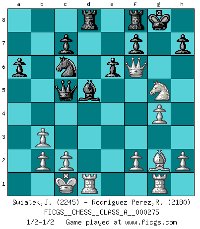 Last move : 1/2-1/2 2024 May 1 18:45:52 [Event "FICGS__CHESS__CLASS_A__000275"] [Site "FICGS"] [Date "2023.11.27"] [Round "1"] [White "Swiatek,Janusz"] [Black "Rodriguez Perez,Rene"] [Result "1/2-1/2"] [WhiteElo "2245"] [BlackElo "2180"] 1.e4 e6 2.d4 d5 3.Nc3 Nf6 4.Bg5 dxe4 5.Nxe4 Be7 6.Bxf6 gxf6 7.Nf3 f5 8.Nc3 a6 9.g3 b5 10.Bg2 Bb7 11.Qe2 b4 12.Na4 O-O 13.O-O-O Qd6 14.Nc5 Bd5 15.Rhg1 Nc6 16.Nb7 Qd7 17.Nc5 Qd6 18.Nb7 Qd7 19.g4 f4 20.Nc5 Bxc5 21.dxc5 Qe7 22.Qd2 Rad8 23.Qxf4 Qxc5 24.Qg5+ Kh8 25.Qf6+ Kg8 26.Qg5+ Kh8 27.Qf6+ Kg8 28.Ng5 b3 29.axb3 1/2-1/2 Follow this game move after move (download)Bobby is the most misunderstood, misquoted celebrity walking the face of this earth. (Yasser Seirawan) Ich weiss nicht was Gott gegen mich auf 1.e4 antworten würde. (Robert James Fischer) Aunque la mayoría de la gente disfruta observar las partidas de los grandes Maestros de ataque, algunos de los jugadores mas notables en la historia han sido los jugadores silenciosos posicionales. Lentamente ellos te aplastan despojandote de tu espacio, congestionando tus piezas y dejandote virtualmente sin nada que hacer. (Yasser Seirawan) Les réformistes prétendent que les progrès de la théorie conduiront à la disparition des échecs, et qu'il faut, pour leur rendre vie, en remanier les règles. En réalité, qu'exprime cette affirmation? Le mépris de l'intuition, de l'imagination et de tous les autres éléments qui font des échecs un art. (Alexander Alekhine) May the force be with you. (Han Solo in Star Wars ep.4)