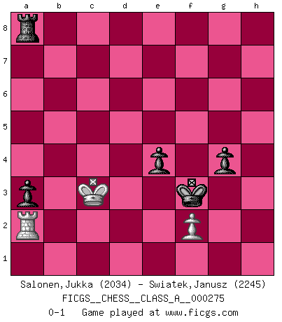 Last move : 0-1 2024 April 10 6:45:54 [Event "FICGS__CHESS__CLASS_A__000275"] [Site "FICGS"] [Date "2023.11.27"] [Round "1"] [White "Salonen,Jukka"] [Black "Swiatek,Janusz"] [Result "0-1"] [WhiteElo "2034"] [BlackElo "2245"] 1.d4 d5 2.c4 e6 3.Nc3 Nf6 4.Nf3 dxc4 5.e4 Bb4 6.Bg5 c5 7.Bxc4 h6 8.Bxf6 Qxf6 9.O-O cxd4 10.e5 Qd8 11.Nxd4 O-O 12.Rc1 Bc5 13.Nf3 Bd7 14.Qe2 Bc6 15.Rfd1 Qb6 16.Bb3 Na6 17.Nd2 Rfd8 18.Ba4 Qxb2 19.Bxc6 bxc6 20.Nce4 Bb4 21.Rb1 Qxa2 22.Ra1 Qc2 23.Rxa6 Rd4 24.Qf3 Bxd2 25.Nd6 Rd5 26.Qxf7+ Kh7 27.Rf1 Ba5 28.g3 Bb6 29.R6a1 Bd4 30.Rac1 Qg6 31.Qxg6+ Kxg6 32.Rxc6 a5 33.Nc4 Rc5 34.Rxc5 Bxc5 35.Ra1 a4 36.Kf1 a3 37.Ra2 Ra4 38.Nd2 Kf5 39.Ke2 Kxe5 40.Kd3 Kd5 41.Nb1 Bb4 42.Nc3+ Bxc3 43.Kxc3 Ke4 44.Kb3 Ra8 45.Kc4 Kf3 46.h4 g5 47.hxg5 hxg5 48.g4 Kxg4 49.Kd3 Kf3 50.Kd4 Ra5 51.Kd3 e5 52.Kc3 e4 53.Kb4 Ra8 54.Kc3 g4 0-1 Follow this game move after move (download)Alekhine is a poet who creates a work of art out of something that would hardly inspire another man to send home a picture post card. (Max Euwe) Auf jeden Fall musst du zuerst Rechtsanwalt werden, damit du deine eigenen Interessen und die deiner Familie vertreten kannst. [Brief an seinen Sohn] (José Raúl Capablanca) Si no le temes a Spassky, entonces elimino el elemento del dinero. (Jim Slater) Le profane ne songe pas à la somme de jouissance dont il se prive, qui méconnaît ce jeu aux ressources aussi variées que passionnantes. (Jean-Marie Jeanton-Lamarche) No enterprise is more likely to succeed than one concealed from the enemy until it is ripe for execution. (Niccolo Machiavelli)