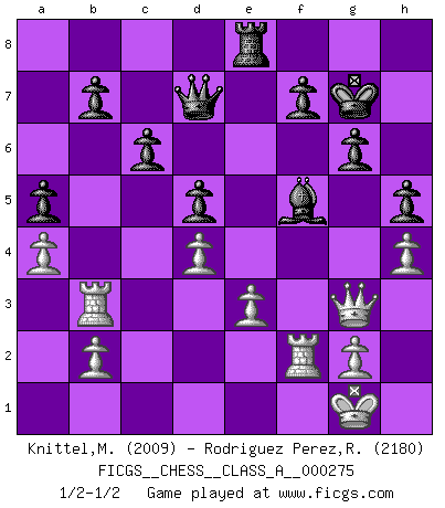 Last move : 1/2-1/2 2024 March 30 21:43:59 [Event "FICGS__CHESS__CLASS_A__000275"] [Site "FICGS"] [Date "2023.11.27"] [Round "1"] [White "Knittel,Martin"] [Black "Rodriguez Perez,Rene"] [Result "1/2-1/2"] [WhiteElo "2009"] [BlackElo "2180"] 1.c4 e6 2.Nc3 d5 3.d4 Nf6 4.cxd5 exd5 5.Bg5 Nbd7 6.e3 c6 7.Bd3 Be7 8.Nf3 O-O 9.O-O Re8 10.h3 Ne4 11.Bf4 Ndf6 12.Ne5 g6 13.a4 a5 14.Qc2 Bd6 15.Kh1 Bxe5 16.Bxe5 Bf5 17.f3 Rxe5 18.fxe4 Rxe4 19.Bxe4 Nxe4 20.Nxe4 Bxe4 21.Qf2 Qe7 22.Ra3 Kg7 23.Kg1 h5 24.h4 Bf5 25.Qg3 Qd7 26.Rb3 Re8 27.Rf2 1/2-1/2 Follow this game move after move (download)When you don't know what to play, wait for an idea to come into your opponent's mind. You may be sure that idea will be wrong. (Siegbert Tarrasch) Ich verstehe Aljechins Kombinationen ganz gut; aber woher er diese Angriffschancen bekommt und wie er die Eröffnung behandelt das ist für mich ein Buch mit sieben Siegeln. (Rudolf Spielmann) El Ajedrez es un juego terrible. Si no dominas el centro, tu oponente tiene una posición mas libre. Si tu tienes el centro, entonces realmente tienes algo de que preocuparte. (Siegbert Tarrasch) Toute estimation doit être constamment réévaluée. (Jacob Estrin) If things go wrong, don't go with them. (Roger Babson)