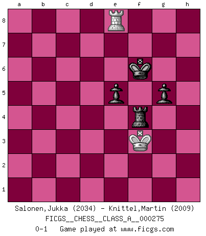 Last move : 0-1 2024 March 11 7:38:2 [Event "FICGS__CHESS__CLASS_A__000275"] [Site "FICGS"] [Date "2023.11.27"] [Round "1"] [White "Salonen,Jukka"] [Black "Knittel,Martin"] [Result "0-1"] [WhiteElo "2034"] [BlackElo "2009"] 1.d4 Nf6 2.c4 e6 3.Nf3 d5 4.Nc3 dxc4 5.e4 Bb4 6.Bg5 c5 7.Bxc4 h6 8.Bxf6 Qxf6 9.O-O cxd4 10.e5 Qd8 11.Nxd4 O-O 12.Qg4 Qc7 13.Qe2 Rd8 14.Ndb5 Qb6 15.a3 Be7 16.Rfd1 Bd7 17.Nd6 Be8 18.Nxe8 Rxe8 19.Bb5 Nc6 20.Rd7 a6 21.Ba4 Rad8 22.Bxc6 Qxc6 23.Rxd8 Rxd8 24.g3 Rd4 25.f3 g5 26.h3 Rc4 27.Kg2 Kg7 28.Qd3 Qc7 29.Rc1 b5 30.Re1 Bxa3 31.Nxb5 axb5 32.bxa3 Qc6 33.Re2 Rc3 34.Qe4 Qd7 35.f4 Rxa3 36.fxg5 hxg5 37.h4 Qd3 38.Qxd3 Rxd3 39.h5 Rd4 40.Kf3 b4 41.g4 b3 42.Rb2 Rd3+ 43.Kg2 Rc3 44.Rb1 Rc2+ 45.Kf3 b2 46.Ke3 Rc4 47.Kf3 Rb4 48.Kg3 f5 49.exf6+ Kxf6 50.Kf3 Ke5 51.Ke3 Rxg4 52.Rxb2 Rh4 53.Kf3 Kf6 54.Rb8 Rxh5 55.Kg3 Rh1 56.Kg4 Rg1+ 57.Kf3 Rf1+ 58.Kg3 Rc1 59.Kg4 Rc4+ 60.Kf3 e5 61.Re8 Rf4+ 0-1 Follow this game move after move (download)During a Chess competition a Chessmaster should be a combination of a beast of prey and a monk. (Alexander Alekhine) Die FIDE ist dabei in die Hände der russischen Mafia zu fallen. (Larry Evans) No existe un remordimiento como el remordimiento del Ajedrez. (H. G. Wells) Ce n'est pas pour s'amuser qu'il joue aux échecs : il célèbre un culte. (Vladimir Nabokov) At work, the authority of a person is inversely proportional to the number of pens that person is carrying. (Dan Rotaru)