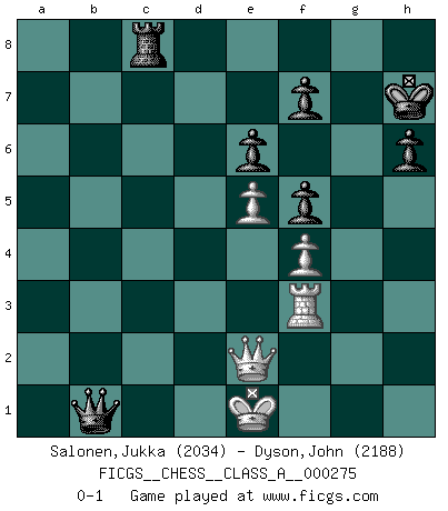 Last move : 0-1 2024 June 3 8:9:33 [Event "FICGS__CHESS__CLASS_A__000275"] [Site "FICGS"] [Date "2023.11.27"] [Round "1"] [White "Salonen,Jukka"] [Black "Dyson,John"] [Result "0-1"] [WhiteElo "2034"] [BlackElo "2188"] 1.d4 Nf6 2.c4 e6 3.Nc3 Bb4 4.e3 O-O 5.Bd3 d5 6.Nf3 dxc4 7.Bxc4 c5 8.O-O cxd4 9.exd4 b6 10.Bg5 Bb7 11.Rc1 h6 12.Bh4 Nc6 13.a3 Bxc3 14.bxc3 Ne7 15.Bxf6 gxf6 16.Re1 Ng6 17.Bd3 f5 18.Ne5 Qg5 19.g3 Rfd8 20.Nxg6 Qxg6 21.Re3 Rd6 22.Qa4 Qf6 23.Rce1 Qd8 24.Rd1 Rc8 25.Qb4 Qd7 26.Be2 Bc6 27.f4 Kh7 28.Kf2 b5 29.Re5 Rd5 30.Bf3 Rxe5 31.dxe5 Qb7 32.Be2 Bh1 33.Rg1 a6 34.a4 a5 35.Qxa5 Ra8 36.Qxb5 Qa7+ 37.Kf1 Be4 38.Qb4 Rd8 39.a5 Bd3 40.Qb6 Bxe2+ 41.Kxe2 Qa8 42.Qe3 Qd5 43.Qc1 Qa2+ 44.Ke3 Rb8 45.Rd1 Qxh2 46.Rf1 Qxg3+ 47.Rf3 Qg2 48.Qd2 Qh1 49.Rg3 Rb5 50.Kf2 Rxa5 51.Rg1 Qh3 52.Rg3 Qh1 53.Rg1 Qh4+ 54.Kg2 Ra4 55.Qf2 Qh5 56.Rf1 Ra8 57.Qf3 Rg8+ 58.Kf2 Qh2+ 59.Ke1 Qc2 60.Qd1 Qxc3+ 61.Qd2 Qb3 62.Qe2 Rc8 63.Rf3 Qb1+ 0-1 Follow this game move after move (download)In life, as in Chess, one's own Pawns block one's way. A man's very wealth, ease, leisure, children, books, which should help him to win, more often checkmate him. (Charles Buxton) Im Internet Chess Club betrug mein Rating vorübergehend 3350 ELO-Punkte. (Sergej Karjakin) El Peón aislado arroja penumbra sobre todo el tablero. (Aaron Nimzovich) Avec des compensations pour le matériel en plus... (Anonyme) Players are not good because they find tactics, it is about the way to find the positions in which those tactics are hidden. (Luc-Olivier Leclerc)