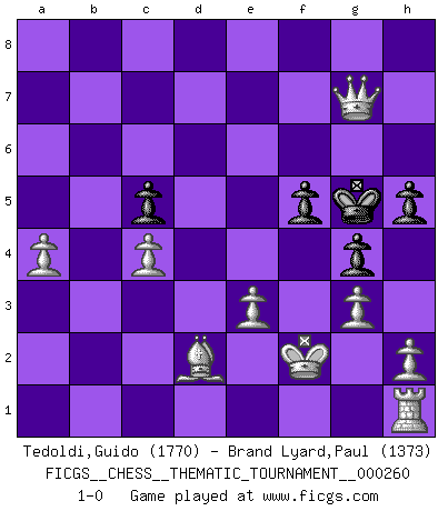 Last move : 1-0 2024 March 24 22:49:41 [Event "FICGS__CHESS__THEMATIC_TOURNAMENT__000260"] [Site "FICGS"] [Date "2023.11.28"] [Round "1"] [White "Tedoldi,Guido"] [Black "Brand Lyard,Paul"] [Result "1-0"] [WhiteElo "1770"] [BlackElo "1373"] 1.d4 Nf6 2.c4 e5 3.dxe5 Ne4 4.a3 Bc5 5.e3 Nxf2 6.Kxf2 O-O 7.Nf3 d6 8.Nc3 dxe5 9.Nxe5 Qxd1 10.Nxd1 f6 11.Nd3 b6 12.Be2 Bd6 13.Nc3 Nc6 14.Bf3 Bb7 15.b4 Rae8 16.Nd5 Rf7 17.g3 Ne5 18.Nxe5 Bxe5 19.Ra2 Bxd5 20.Bxd5 Rd8 21.Bxf7+ Kxf7 22.Rd2 Rxd2+ 23.Bxd2 Bb2 24.a4 g5 25.b5 a5 26.bxa6 g4 27.a7 f5 28.a8Q c5 29.Qb7+ Kf6 30.Qxb6+ Kg5 31.Qxb2 h5 32.Qg7+ 1-0 Follow this game move after move (download)Chess holds its master in its own bonds, shackling the mind and brain so that the inner freedom of the very strongest must suffer. (Albert Einstein) Kleine Schachspieler machen Mist, und große Schachspieler machen Mist, aber große machen weniger Mist. (Fritz Sämisch) Nada excita más a Grandes Maestros aburridos que una novedad teórica. (Dominic Lawson) Le joueur d'Echecs qui veut atteindre le top est obligé de développer son propre credo créatif. Alexeï Stepanovicth Souétine. Il est facile d'écrire des livres ! Ce qui est difficile, c'est de jouer ! (Alexeï Stepanovicth Souétine) If you know the enemy and know yourself you need not fear the results of a hundred battles. (Sun Tzu)