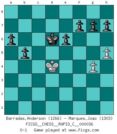 Last move : 0-1 2007 November 23 17:50:5 [Event "FICGS__CHESS__RAPID_C__000036"] [Site "FICGS"] [Date "2007.09.10"] [Round "1"] [White "Barradas,Anderson"] [Black "Marques,Joao"] [Result "0-1"] [WhiteElo "1266"] [BlackElo "1303"] 1.e4 c5 2.Nf3 e6 3.d4 cxd4 4.Nxd4 a6 5.Nc3 Qc7 6.Bd3 Nf6 7.O-O Bb4 8.a3 Bxc3 9.bxc3 Qxc3 10.Be3 O-O 11.Ne2 Qc7 12.Rb1 Ng4 13.g3 Nxe3 14.fxe3 Nc6 15.Nd4 Ne5 16.Nf3 b5 17.Rc1 Bb7 18.Nxe5 Qxe5 19.Rf4 d5 20.Qf3 dxe4 21.Bxe4 Bxe4 22.Rxe4 Qb2 23.Rf1 Qxa3 24.Rh4 Qc5 25.Rf4 Ra7 26.Qg4 Qxe3+ 27.Kh1 Re7 28.Kg2 Rc7 29.R4f3 Qd2+ 30.R1f2 Qd5 31.Qf4 Qc6 32.h4 Rfc8 33.h5 Qb7 34.Qg4 Rxc2 35.Qd4 Rxf2+ 36.Qxf2 Rc3 37.g4 Rxf3 38.Qxf3 Qxf3+ 39.Kxf3 Kf8 40.Ke3 Ke7 41.Kd4 Kd6 0-1 Sicilian : Kan, 5.Nc3 Kingside Castling by player White (move 7) Kingside Castling by player Black (move 10) 10 pieces endgame at move 39 : White KPP , Black KPPPPPP WHITE : King + 2 Pawns BLACK : King + 6 Pawns Player Black won this chess game. Follow this game move after move (download)If you aren't afraid of Spassky, then I have removed the element of money. (Jim Slater) Wie bekannt hörte Morphy 1859 auf, Schach zu spielen. Seine Enttäuschung galt nicht so sehr dem Schach, wie den Schachspielern. (Robert James Fischer) Diferente gente reacciona diferentemente en aceptar la derrota. (Bobby Fischer) Les échecs sont plus proches de l'art de l'assassinat que de l'art de la guerre. (Arturo Perez-Reverte) I live to kill Traxler counterattack. (Ilmars Cirulis)