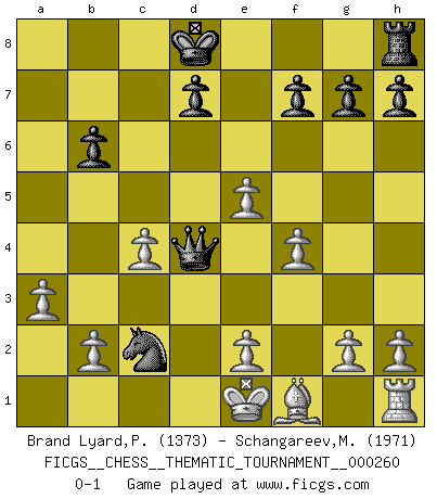 Last move : 0-1 2023 December 3 16:29:1 [Event "FICGS__CHESS__THEMATIC_TOURNAMENT__000260"] [Site "FICGS"] [Date "2023.11.28"] [Round "1"] [White "Brand Lyard,Paul"] [Black "Schangareev,Mirzian"] [Result "0-1"] [WhiteElo "1373"] [BlackElo "1971"] 1.d4 Nf6 2.c4 e5 3.dxe5 Ne4 4.a3 b6 5.Qd5 Nc5 6.Qxa8 Bb7 7.Qxa7 Nc6 8.Qxb7 Nxb7 9.f4 Nd4 10.Kd1 Qa8 11.Nf3 Qa4+ 12.Ke1 Nc2+ 13.Kf2 Nxa1 14.Nc3 Qc2 15.Bd2 Nc5 16.Nd5 Ne4+ 17.Ke3 Bc5+ 18.Nd4 Nxd2 19.Nxc7+ Kd8 20.Ncb5 Bxd4+ 21.Nxd4 Qe4+ 22.Kxd2 Qxd4+ 23.Ke1 Nc2+ 0-1 Follow this game move after move (download)The enormous mental resilience, without which no Chess player can exist, was so much taken up by Chess that he could never free his mind of this game. (Albert Einstein) Sie bekommen vielleicht den Eindruck, dass die Spitzenspieler überhaupt gar nicht so stark sind. Aber das stimmt nicht. Es ist eine Illusion. Mit einem Computer an der Seite ist es sehr leicht, Urteile zu fällen, aber wenn man alleine am Brett sitzt, sieht die Sache ganz anders aus. (Vladimir Kramnik) Puntos débiles o agujeros en la posición de tu oponente deben de ser ocupados por piezas, no Peones. (Siegbert Tarrasch) La conception d'un plan est le processus par lequel un joueur exploite les avantages de sa position tout en s'efforçant d'en réduire au minimum les inconvénients. Afin de garantir le succès, un plan doit toujours se fonder sur un diagnostic objectif des particularités d'une position. La conception d'un plan est d'autant plus difficile que la position est équilibrée, et grandement facilitée lorsqu'il n'existe qu'un seul plan susceptible de répondre aux exigences de la position. (Harry Golombek) They misunderestimated me. (George W. Bush, Bentonville nov. 6, 2000)