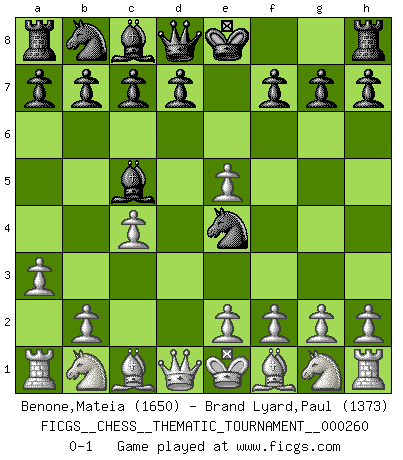 Last move : 0-1 2024 January 7 14:20:56 [Event "FICGS__CHESS__THEMATIC_TOURNAMENT__000260"] [Site "FICGS"] [Date "2023.11.28"] [Round "1"] [White "Benone,Mateia"] [Black "Brand Lyard,Paul"] [Result "0-1"] [WhiteElo "1650"] [BlackElo "1373"] 1.d4 Nf6 2.c4 e5 3.dxe5 Ne4 4.a3 Bc5 0-1 This chess game has been lost on time (started : 2023.11.28 0:29:43) Follow this game move after move (download)You cannot play at Chess if you are kind-hearted. (French Proverb) Die Leute spielen gegen mich seit 15 Jahren unter Ihren Möglichkeiten. (Robert James Fischer) Creo que una cierta cantidad de temperamento es esperada de los genios del Ajedrez. (Ron Gross) Le moment que je préfère le plus dans une rencontre, c'est celui où je sens que la personnalité de l'adversaire se brise. (Robert Fischer) Children in the dark cause accidents, accidents in the dark cause children. (Unknown)