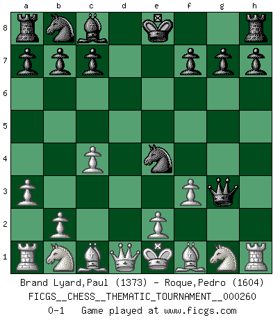 Last move : 0-1 2023 November 30 11:26:58 [Event "FICGS__CHESS__THEMATIC_TOURNAMENT__000260"] [Site "FICGS"] [Date "2023.11.28"] [Round "1"] [White "Brand Lyard,Paul"] [Black "Roque,Pedro"] [Result "0-1"] [WhiteElo "1373"] [BlackElo "1604"] 1.d4 Nf6 2.c4 e5 3.dxe5 Ne4 4.a3 d6 5.exd6 Bxd6 6.f3 Qh4+ 7.g3 Bxg3+ 8.hxg3 Qxg3+ 0-1 Follow this game move after move (download)The stomach is an essential part of the Chess master. (Bent Larsen) Kein Großmeister ist normal. Sie unterscheiden sich nur im Ausmaß Ihrer Verrücktheit. (Viktor Kortschnoi) Tu sabes, camarada Pachman, no disfruto el ser un Ministro, preferería jugar al Ajedrez como tu. (Che Guevara) Demandez au pauvre Cg1 ce qu'il en pense. Eduard Gufeld à propos de la variante Saemisch de l'Est-Indienne. Life is like a play: it's not the length but the excellence of the acting that matters. (Seneca)