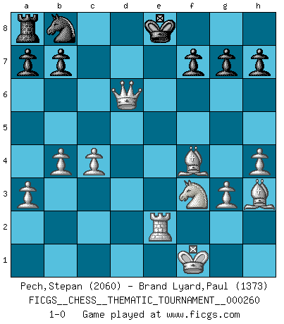 Last move : 1-0 2024 May 11 0:58:46 [Event "FICGS__CHESS__THEMATIC_TOURNAMENT__000260"] [Site "FICGS"] [Date "2023.11.28"] [Round "1"] [White "Pech,Stepan"] [Black "Brand Lyard,Paul"] [Result "1-0"] [WhiteElo "2060"] [BlackElo "1373"] 1.d4 Nf6 2.c4 e5 3.dxe5 Ne4 4.a3 Bc5 5.e3 Nxf2 6.Kxf2 d6 7.b4 Qh4+ 8.g3 Bxe3+ 9.Bxe3 Qe4 10.Nf3 Bg4 11.Nbd2 Qf5 12.exd6 cxd6 13.h3 Bxf3 14.Nxf3 Kd7 15.h4 Re8 16.Bf4 Re6 17.Bh3 Qf6 18.Qxd6+ Ke8 19.Rhe1 Qb2+ 20.Kf1 Rxe1+ 21.Rxe1+ Qe2+ 22.Rxe2+ 1-0 Follow this game move after move (download)Best by test: 1. e4 (Bobby Fischer) Je älter ich werde, um so mehr schätze ich die Bauern. (Paul Keres) Una buena memoria, concentración, imaginación y una fuerte voluntad, se requiere para llegar a ser un buen jugador. (Bobby Fischer) Il a essayé de se convaincre qu'il pourrait empêcher toutes les erreurs et ne jamais perdre. L'horreur ! Gary Kasparov au sujet de Robert Fischer. You think that education is too expensive ? Try ignorance. (Derek Bok)