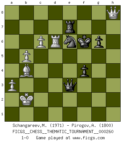 Last move : 1-0 2024 March 25 22:1:1 [Event "FICGS__CHESS__THEMATIC_TOURNAMENT__000260"] [Site "FICGS"] [Date "2023.11.28"] [Round "1"] [White "Schangareev,Mirzian"] [Black "Pirogov,Andrey Mikhaylovich"] [Result "1-0"] [WhiteElo "1971"] [BlackElo "1800"] 1.d4 Nf6 2.c4 e5 3.dxe5 Ne4 4.a3 d6 5.Qc2 Nc5 6.exd6 Bxd6 7.Nc3 O-O 8.Nf3 Qf6 9.e4 Bg4 10.Nd5 Qd8 11.b4 Bxf3 12.gxf3 Ne6 13.Bb2 Nd7 14.O-O-O c6 15.Nf6+ Nxf6 16.e5 Bxe5 17.Bxe5 Nd7 18.f4 Qe7 19.Bc3 Nf6 20.Rg1 Nxf4 21.Re1 Qd6 22.c5 Qd8 23.Rd1 N4d5 24.Qf5 Ne8 25.Bc4 Qh4 26.Bxd5 cxd5 27.Rxd5 a5 28.b5 Qxh2 29.Qg4 g6 30.Rg2 Qh1+ 31.Rd1 Qh6+ 32.Kb2 Ng7 33.Qf3 Rae8 34.Rg4 f5 35.Rg3 f4 36.Rh3 Qg5 37.Rd7 Re7 38.Qxb7 Rfe8 39.c6 Qc5 40.Rhd3 Ne6 41.Bxa5 Qxf2+ 42.Rd2 Qc5 43.Rxe7 Rxe7 44.Qb8+ Kf7 45.Bb4 Qe3 46.Qh8 Nc5 47.Qxh7+ Kf6 48.Qh8+ Kf7 49.Qh7+ Kf6 50.Rd6+ Ne6 51.Qh8+ 1-0 Follow this game move after move (download)Chess is a foolish expedient for making idle people believe they are doing something very clever when they are only wasting their time. (George Bernard Shaw) Wer wird heute Abend ihr Gegner sein? -- Heute Abend spiele ich gegen die schwarzen Steine. (Akiba Rubinstein) a manera como él juega al Ajedrez, demuestra la completa naturaleza de un hombre. (Stanley Ellin) Assurément je connaissais par expérience le mystérieux attrait de ce jeu royal, le seul entre tous les jeux inventés par les hommes qui échappe souverainement à la tyrannie du hasard, le seul où l'on ne doive sa victoire qu'à son intelligence ou plutôt à une certaine forme d'intelligence. Mais n'est-ce pas déjà le limiter injurieusement que d'appeler les échecs un jeu ? N'est-ce pas une science, un art ou quelque chose qui, comme le cercueil de Mahomet entre ciel et terre, est suspendu entre l'un et l'autre, et qui réunit un nombre incroyable de contraires ? [...] C'est une pensée qui ne mène à rien, une mathématique qui n'établit rien, un art qui ne laisse pas d'uvre, une architecture sans matière; et il l'a prouvé néanmoins qu'il était plus durable, à sa manière, que les livres ou que tout autre monument, ce jeu unique qui appartient à tous les peuples et à tous les temps, et dont personne ne sait quel dieu en fit don à la terre pour tuer l'ennui, pour aiguiser l'esprit et stimuler l'âme. Où commence-t-il, où finit-il ? (Stefan Zweig) The Internet is so big, so powerful and pointless that for some people it is a complete substitute for life. (Andrew Brown)