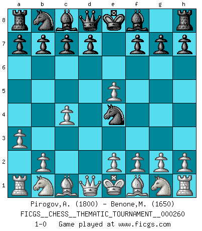 Last move : 1-0 2024 January 7 0:36:39 [Event "FICGS__CHESS__THEMATIC_TOURNAMENT__000260"] [Site "FICGS"] [Date "2023.11.28"] [Round "1"] [White "Pirogov,Andrey Mikhaylovich"] [Black "Benone,Mateia"] [Result "1-0"] [WhiteElo "1800"] [BlackElo "1650"] 1.d4 Nf6 2.c4 e5 3.dxe5 Ne4 4.a3 1-0 This chess game has been lost on time (started : 2023.11.28 0:29:43) Follow this game move after move (download)A thorough understanding of the typical mating continuations makes the most complicated sacrificial combinations leading up to them not only not difficult, but almost a matter of course. (Siegbert Tarrasch) Es ist besser die Steine des Gegners zu opfern. (Savielly Grigorievitsch Tartakower) La vida es como el Ajedrez, con lucha, competición y eventos buenos y malos. (Benjamin Franklin) Donnez-moi un Cavalier en 6e et je gagnerais toutes mes parties. (Steinitz) Any activity becomes creative when the doer cares about doing it right or doing it better. (John Updike)