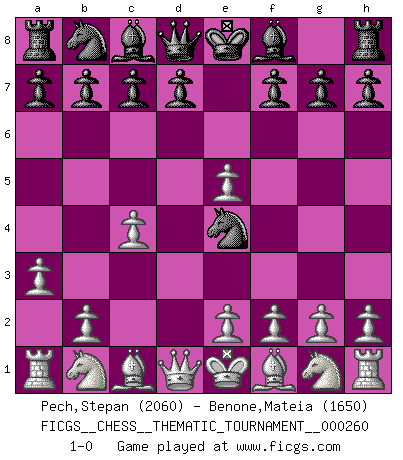 Last move : 1-0 2024 January 7 0:36:39 [Event "FICGS__CHESS__THEMATIC_TOURNAMENT__000260"] [Site "FICGS"] [Date "2023.11.28"] [Round "1"] [White "Pech,Stepan"] [Black "Benone,Mateia"] [Result "1-0"] [WhiteElo "2060"] [BlackElo "1650"] 1.d4 Nf6 2.c4 e5 3.dxe5 Ne4 4.a3 1-0 This chess game has been lost on time (started : 2023.11.28 0:29:43) Follow this game move after move (download)I guess a certain amount of temperament is expected of Chess geniuses. (Ron Gross) Es ist im Leben wie im Schachspiel. Wir entwerfen einen Plan, dieser bleibt jedoch bedingt durch das, was im Schachspiel dem Gegner, im Leben dem Schicksal zu tun belieben wird. (Arthur Schopenhauer) Con el tiempo, empecé a progresar en partidas decisivas. Tal vez porque me di cuenta de una simple verdad: no solo estaba yo nervioso sino también mi oponente. (Mikhail Tal) Avec des compensations pour le matériel en plus... (Anonyme) To be champion requires more than simply being a strong player; one has to be a strong human being as well. (Anatoly Karpov)