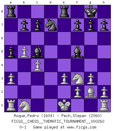Last move : 0-1 2024 July 15 14:43:13 [Event "FICGS__CHESS__THEMATIC_TOURNAMENT__000260"] [Site "FICGS"] [Date "2023.11.28"] [Round "1"] [White "Roque,Pedro"] [Black "Pech,Stepan"] [Result "0-1"] [WhiteElo "1604"] [BlackElo "2060"] 1.d4 Nf6 2.c4 e5 3.dxe5 Ne4 4.a3 d6 5.Qc2 Nc5 6.b4 Ne6 7.exd6 Bxd6 8.Bb2 a5 9.b5 O-O 10.g3 Re8 11.Nf3 Nc5 12.Bg2 Qd7 13.Bd4 Qf5 14.Qxf5 Bxf5 15.Bxc5 Bxc5 16.e3 Nd7 0-1 This chess game has been lost on time (started : 2023.11.28 0:29:43) Follow this game move after move (download)Those who say they understand Chess, understand nothing. (Robert Hubner) Ich habe Kasparov in Rente geschickt. (Veselin Topalov) Entre mas años cumplo, mas valoro los Peones. (Keres) L'action d'une oeuvre littéraire se déroule sur un champ de bataille. Les masques et les types du drame moderne correspondent aux pièces du jeu d'échecs. L'intrigue correspond aux coups et aux gambits, c'est à dire aux techniques du jeu telles qu'utilisées et interprétées par les joueurs. Les tactiques et les péripéties [mouvements] correspondent aux coups exécutés par l'adversaire. (Viktor Shklovsky) Sometimes it pays to stay in bed in Monday, rather than spending the rest of the week debugging Monday's code. (Dan Salomon)
