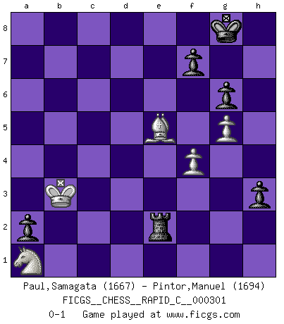 Last move : 0-1 2023 December 16 3:45:52 [Event "FICGS__CHESS__RAPID_C__000301"] [Site "FICGS"] [Date "2023.11.30"] [Round "1"] [White "Paul,Samagata"] [Black "Pintor,Manuel"] [Result "0-1"] [WhiteElo "1667"] [BlackElo "1694"] 1.e4 e5 2.Nf3 Nc6 3.Bc4 Bc5 4.h3 Qf6 5.a3 a5 6.Nc3 d6 7.d3 Qg6 8.g3 h5 9.Nh4 Qf6 10.Qe2 Nd4 11.Qd2 c6 12.Ne2 b5 13.Ba2 Ne7 14.Nxd4 Bxd4 15.c3 Bb6 16.d4 exd4 17.cxd4 Bxd4 18.Rb1 O-O 19.Qe2 Ng6 20.Nf3 d5 21.Bg5 Qd6 22.Nxd4 dxe4 23.Rd1 Qc5 24.Be3 Qd6 25.Nxb5 Qe7 26.Nc3 h4 27.g4 Ba6 28.Qc2 Bd3 29.Qa4 Ne5 30.Rxd3 Nxd3+ 31.Ke2 Nxb2 32.Qc2 Nd3 33.Rd1 Rfd8 34.Bc4 Ne5 35.Qxe4 Rxd1 36.Nxd1 Re8 37.Qc2 Qxa3 38.f4 Nxc4 39.Qxc4 c5 40.g5 Qb4 41.Qc3 Qb5+ 42.Kf2 c4 43.Kf3 Qd5+ 44.Ke2 a4 45.Nf2 Qb5 46.Kf3 Qb3 47.Bd4 g6 48.Ne4 Qd1+ 49.Ke3 Qh1 50.Be5 Qxh3+ 51.Kd4 Rd8+ 52.Kxc4 Rc8+ 53.Nc5 Qe6+ 54.Kb5 Qd5 55.Qc4 Qc6+ 56.Kb4 Qb6+ 57.Qb5 Qxb5+ 58.Kxb5 a3 59.Nb3 Rc2 60.Kb4 a2 61.Na1 Re2 62.Kb3 h3 0-1 Follow this game move after move (download)There is only one thing Fischer does in Chess without pleasure: to lose ! (Boris Spassky) Bogoljubow: Matt in vier Zügen! Tartakower: Ich verbitte mir jede Belästigung! (Savielly Grigorievitsch Tartakower) Tu puedes aprender mucho mas de una partida que pierdas que de una partida ganada. Tendras que perder cientos de partidas antes de llegar a ser un buen jugador. (Jose Raul Capablanca) On peut tirer plus d'utilité d'une partie perdue que de 100 parties gagnées. (Capablanca) Man is still the most extraordinary computer of all. (John F. Kennedy)
