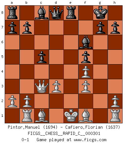 Last move : 0-1 2023 December 27 19:58:31 [Event "FICGS__CHESS__RAPID_C__000301"] [Site "FICGS"] [Date "2023.11.30"] [Round "1"] [White "Pintor,Manuel"] [Black "Cafiero,Florian"] [Result "0-1"] [WhiteElo "1694"] [BlackElo "1637"] 1.e4 c5 2.f4 d5 3.exd5 Nf6 4.c4 e6 5.Nc3 exd5 6.cxd5 Nxd5 7.Nxd5 Qxd5 8.d3 Nc6 9.Nf3 Bd6 10.Qe2+ Be7 11.Qe4 Qd8 12.Ng5 Nd4 13.Rb1 f5 14.Qe5 O-O 15.Nf3 Nxf3+ 16.gxf3 Re8 17.Qc3 Bf6 0-1 Follow this game move after move (download)I won't play with you anymore. You have insulted my friend. - When an opponent cursed himself for a blunder. (Miguel Najdorf) Es tut gut, die Entwicklungsperiode von, [...] demokratischem Geist durchdringen zu lassen. Wie undemokratisch wäre es doch beispielsweise, den einen Offizier große Spaziertouren vornehmen zu lassen, während die anderen zu Hause säßen und sich entsetzlich langweilten. (Aaron Nimzowitsch) La vida es como el Ajedrez, con lucha, competición y eventos buenos y malos. (Benjamin Franklin) Le moment que je préfère le plus dans une rencontre, c'est celui où je sens que la personnalité de l'adversaire se brise. (Robert Fischer) Coffee just isn't my cup of tea. (Unknown)