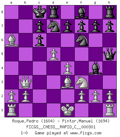 Last move : 1-0 2023 December 13 13:36:21 [Event "FICGS__CHESS__RAPID_C__000301"] [Site "FICGS"] [Date "2023.11.30"] [Round "1"] [White "Roque,Pedro"] [Black "Pintor,Manuel"] [Result "1-0"] [WhiteElo "1604"] [BlackElo "1694"] 1.Nf3 Nc6 2.d4 d5 3.c4 Nf6 4.cxd5 Qxd5 5.Nc3 Qa5 6.Bd2 Qh5 7.e4 Bg4 8.Qb3 O-O-O 9.d5 Nb8 10.Nb5 Nbd7 11.Nxa7+ Kb8 12.Nc6+ Kc8 13.Be3 bxc6 14.Ba6+ 1-0 Follow this game move after move (download)Many have become Chess Masters, no one has become the Master of Chess. (Siegbert Tarrasch) Ohne Leiden bildet sich kein Charakter. (Ernst Freiherr von Feuchtersleben) El Ajedrez hace al hombre ser mas sabio y ver mas claro. (Vladimir Putin) Des points faibles ou des trous dans la position de l'adversaire doivent être occupés par des pièces et non pas par des pions. (Siegbert Tarrasch) They say in chess you've got to kill the queen, and then you mate it... Oh I, do you ? (Red Hot Chili Peppers, Fortune faded)