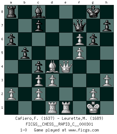 Last move : 1-0 2023 December 24 15:55:45 [Event "FICGS__CHESS__RAPID_C__000301"] [Site "FICGS"] [Date "2023.11.30"] [Round "1"] [White "Cafiero,Florian"] [Black "Leurette,Marc-Antoine"] [Result "1-0"] [WhiteElo "1637"] [BlackElo "1689"] 1.e4 e5 2.Nf3 Nc6 3.Bb5 Nf6 4.d3 a6 5.Bxc6 dxc6 6.Nxe5 Bd6 7.Nf3 O-O 8.O-O Re8 9.h3 c5 10.Re1 Be5 11.Nxe5 Rxe5 12.Nc3 b5 13.Be3 Bb7 14.f4 Rh5 15.e5 Nd5 16.Qxh5 Nxc3 17.bxc3 c4 18.Rad1 Qd5 19.Qg4 Bc8 20.f5 f6 21.exf6 Qf7 22.Bd4 g6 23.Qe4 1-0 Follow this game move after move (download)Modern Chess is too much concerned with things like Pawn structure. Forget it, Checkmate ends the game. (Nigel Short) Ein bischen Romantik kann weder im Schach noch in der Liebe schaden. Also versuche ich mich ab und zu daran zu erinnern. (Nigel Short) Yo nunca en mi vida he jugado la Defensa Francesa, que viene siendo la más aburrida de todas las Aperturas. (Wilhelm Steinitz) Donnez-moi un Cavalier en 6e et je gagnerais toutes mes parties. (Steinitz) It is not true that people stop pursuing dreams because they grow old, they grow old because they stop pursuing dreams. (Gabriel Garcia Marquez)