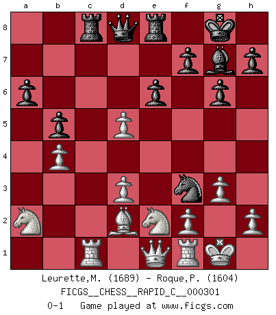 Last move : 0-1 2023 December 19 16:59:20 [Event "FICGS__CHESS__RAPID_C__000301"] [Site "FICGS"] [Date "2023.11.30"] [Round "1"] [White "Leurette,Marc-Antoine"] [Black "Roque,Pedro"] [Result "0-1"] [WhiteElo "1689"] [BlackElo "1604"] 1.e4 c5 2.Nc3 a6 3.g3 b5 4.Bg2 Bb7 5.d3 d6 6.a3 g6 7.Bd2 Bg7 8.Nge2 e6 9.b4 Ne7 10.O-O Nd7 11.Rb1 cxb4 12.axb4 Rc8 13.Qe1 O-O 14.Rc1 Re8 15.Na2 d5 16.exd5 Bxd5 17.Bxd5 Nxd5 18.c4 Ne5 19.cxd5 Nf3+ 0-1 Follow this game move after move (download)Up to this point White has been following well-known analysis. But now he makes a fatal error: he begins to use his own head. (Siegbert Tarrasch) Wenn Du nicht kämpfst, um anderen etwas zu beweisen, sondern nur für Dich selbst, dann bist du fast unbesiegbar. (Garry Kasparov) El pensamiento metódico es mas útil en el Ajedrez que la inspiración. (C. J. S. Purdy) Même un GMI sait rarement calculer sur plus de cinq coups une attaque à sacrifices. (Rudolf Spielmann) Always two there are. No more no less. A master, and an apprentice. (Master Yoda in Star Wars ep.1)