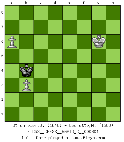 Last move : 1-0 2024 March 18 13:56:21 [Event "FICGS__CHESS__RAPID_C__000301"] [Site "FICGS"] [Date "2023.11.30"] [Round "1"] [White "Strohmeier,Josef"] [Black "Leurette,Marc-Antoine"] [Result "1-0"] [WhiteElo "1648"] [BlackElo "1689"] 1.e4 e5 2.Nf3 Nc6 3.Bb5 Nf6 4.O-O Nxe4 5.Re1 Nd6 6.Bf1 Be7 7.Nxe5 Nxe5 8.Rxe5 f6 9.Re1 O-O 10.d4 b6 11.g3 Bb7 12.Bg2 Bxg2 13.Kxg2 Re8 14.c3 Nf7 15.Nd2 d5 16.Nf1 c6 17.Ne3 Qc8 18.Qc2 a5 19.Nf5 Ra7 20.h4 Bd6 21.Bd2 Bf8 22.Bf4 g6 23.Ne3 Bd6 24.Bxd6 Nxd6 25.f3 Rae7 26.Qd2 Kg7 27.Ng4 Nf5 28.Rxe7+ Rxe7 29.Re1 Qc7 30.Rxe7+ Qxe7 31.Kf2 h5 32.Ne3 Qd7 33.Ng2 Qd6 34.Qf4 Qxf4 35.Nxf4 Kh6 36.Ne6 g5 37.hxg5+ Kg6 38.gxf6 Kxf6 39.Nd8 c5 40.dxc5 bxc5 41.Nb7 d4 42.cxd4 cxd4 43.Nxa5 Ke5 44.Nc4+ Kd5 45.b3 Kc5 46.g4 hxg4 47.fxg4 Nh4 48.g5 Kb4 49.Kg3 Nf5+ 50.Kf4 Ne7 51.Ke5 Nc6+ 52.Ke4 Kc3 53.Kf5 d3 54.g6 d2 55.Nxd2 Ne7+ 56.Kf6 Nxg6 57.Kxg6 Kxd2 58.a4 Kc3 59.a5 Kb4 60.a6 1-0 Follow this game move after move (download)Chess is not like life... it has rules ! (Mark Pasternak) Weshalb minderdergeübte Spieler mit g2-g4 beginnen? Die betreffenden sind unschlüssig, ob sie nun rechts (h4) oder links (f4) beginnen sollen, und in ihrer Ratlosigkeit entschliessen sie sich nach guter Bürgerart dazu, den goldenen Mittelweg zu wählen. (Aaron Nimzowitsch) Yo he agregado estos principios a la ley: pongan los Caballos en acción antes de que los dos Alfiles sean desarrollados. (Emanuel Lasker) Un footballeur joue avec ses pieds, parfois avec sa tête. Un joueur d'échecs ne joue qu'avec sa tête. Et quand il ne joue plus, il meurt. (Jacob Murray) Over-the-board chess is the favorite of mortals, correspondence chess is the favorite of the gods. (Eduard Dyckhoff)