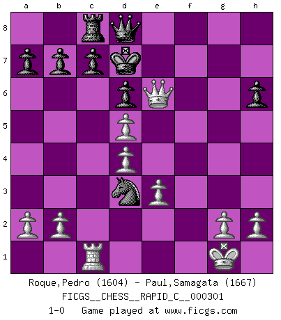 Last move : 1-0 2023 December 13 18:2:23 [Event "FICGS__CHESS__RAPID_C__000301"] [Site "FICGS"] [Date "2023.11.30"] [Round "1"] [White "Roque,Pedro"] [Black "Paul,Samagata"] [Result "1-0"] [WhiteElo "1604"] [BlackElo "1667"] 1.Nh3 e5 2.d4 e4 3.c4 Nf6 4.Bg5 Be7 5.Nc3 h6 6.Bxf6 Bxf6 7.Nxe4 O-O 8.e3 d6 9.Nxf6+ Qxf6 10.Nf4 Nc6 11.Bd3 Bd7 12.Nd5 Qd8 13.Qf3 Be6 14.Rc1 Rc8 15.O-O Qg5 16.Qe4 g6 17.f4 Qd8 18.f5 Bxd5 19.cxd5 Nb4 20.fxg6 Nxd3 21.gxf7+ Rxf7 22.Rxf7 Kxf7 23.Qh7+ Ke8 24.Qg8+ Kd7 25.Qe6+ 1-0 Follow this game move after move (download)All my games are real. (Bobby Fischer) Wenn ich Weiß habe gewinne ich weil ich Weiß habe, wenn ich Schwarz habe gewinne ich weil ich Bogoljubov bin. (Efim Bogoljubov) En el tablero, la mentira e hipocresía no sobreviven mucho. (Emanuel Lasker) On entre au jeu d'Echecs comme on entre en Religion. Pour le joueur d'Echecs, la partie d'Echecs c'est l'office, la messe, le défilé du 1er Mai, le dépôt de gerbe au Monument aux Morts. C'est un drame sacré. (Michel Roos) Computers are like Old Testament gods; lots of rules and no mercy. (Joseph Campbell)