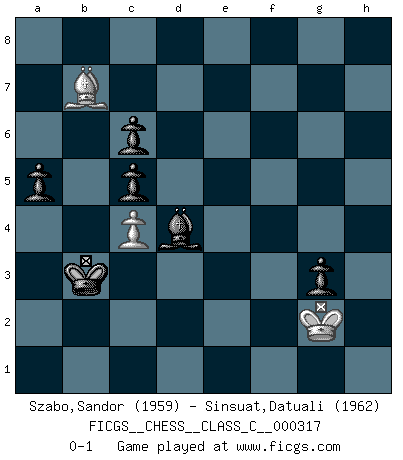 Last move : 0-1 2024 May 9 18:54:30 [Event "FICGS__CHESS__CLASS_C__000317"] [Site "FICGS"] [Date "2023.11.30"] [Round "1"] [White "Szabo,Sandor"] [Black "Sinsuat,Datuali"] [Result "0-1"] [WhiteElo "1959"] [BlackElo "1962"] 1.d4 c6 2.c4 d6 3.Nc3 Nd7 4.e4 Qc7 5.Be3 e5 6.d5 Be7 7.Nf3 Ngf6 8.Nd2 Nc5 9.Be2 a5 10.O-O O-O 11.b3 Bd7 12.Rc1 h6 13.h3 Nh7 14.a3 Bg5 15.Bxc5 dxc5 16.Qc2 Rad8 17.Rcd1 Be7 18.Rfe1 g6 19.Bf1 Kg7 20.Qb2 Bc8 21.Re3 f5 22.Nf3 f4 23.Red3 Nf6 24.Qd2 Ne8 25.Qb2 Nf6 26.Qd2 Ne8 27.Nh4 Bxh4 28.d6 Nxd6 29.Rxd6 f3 30.Rxd8 Rxd8 31.Qc2 fxg2 32.Bxg2 Rf8 33.Rd2 h5 34.a4 Qf7 35.Nd1 g5 36.Rd3 g4 37.hxg4 hxg4 38.Qd2 Qf4 39.Kf1 g3 40.Qxf4 exf4 41.fxg3 fxg3 42.Kg1 Rd8 43.Rxd8 Bxd8 44.Bf3 Kf6 45.Kg2 Bc7 46.Ne3 Be6 47.Nf5 Bxf5 48.exf5 Kxf5 49.Kf1 Ke5 50.Ke2 Kd4 51.Kd2 Bf4+ 52.Ke1 Kc3 53.Bd1 Be5 54.Ke2 Bd4 55.Kf1 Kd2 56.Bg4 Kc2 57.Bc8 Kxb3 58.Bxb7 Kxa4 59.Kg2 Kb3 0-1 Follow this game move after move (download)I like to say that Bobby Fischer was the greatest player ever. But what made Fischer a genius was his ability to blend an American freshness and pragmatism with Russian ideas about strategy. (Bruce Pandolfini) Vom Schach wurde gesagt das Leben sei dafür nicht lange genug. Aber das ist der Fehler des Lebens, nicht des Schach'. (Irving Chernev) Alekhine es un poeta que crea un trabajo de arte de algo que raramente inspiraría a otra persona a mandar una tarjeta postal. (Max Euwe) Le moment que je préfère le plus dans une rencontre, c'est celui où je sens que la personnalité de l'adversaire se brise. (Robert Fischer) Just because you do not take an interest in politics doesn't mean politics won't take an interest in you. (Pericles 430 B.C.)