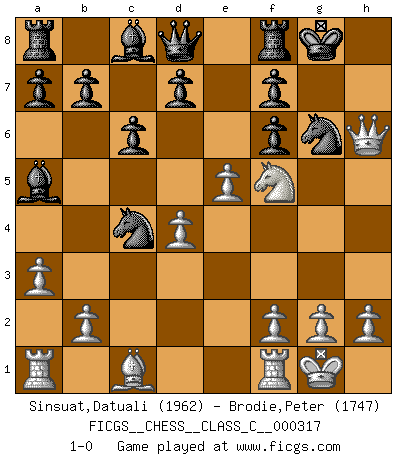 Last move : 1-0 2024 March 29 21:28:48 [Event "FICGS__CHESS__CLASS_C__000317"] [Site "FICGS"] [Date "2023.11.30"] [Round "1"] [White "Sinsuat,Datuali"] [Black "Brodie,Peter"] [Result "1-0"] [WhiteElo "1962"] [BlackElo "1747"] 1.e4 e5 2.Nf3 Nc6 3.Bb5 Bc5 4.c3 Nf6 5.d4 exd4 6.e5 Nd5 7.cxd4 Bb4+ 8.Nbd2 O-O 9.O-O Nce7 10.Bc4 c6 11.Ne4 h6 12.a3 Ba5 13.Nh4 Ng6 14.Nf5 Nb6 15.Qh5 Nxc4 16.Nf6+ gxf6 17.Qxh6 1-0 Follow this game move after move (download)A big shock; the best chess player in history has passed away. (Lajos Portisch, about Bobby Fischer's death) Mein Gehirn das ist mein zweitwichtigstes Organ [Aus dem Film: Der Schläfer]. (Woody Allen) La maestría del Ajedrez consiste esencialmente en analizar posiciónes de Ajedrez con precisión. (Mikhail Botvinnik) Karpov est une pièce de musée. (Garry Kasparov) The Movers & Shakers of this world are those who play chess in the mornings and go to the disco in the evenings. (Dinesh De Silva)