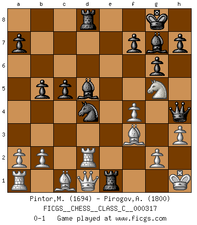 Last move : 0-1 2023 December 11 15:17:37 [Event "FICGS__CHESS__CLASS_C__000317"] [Site "FICGS"] [Date "2023.11.30"] [Round "1"] [White "Pintor,Manuel"] [Black "Pirogov,Andrey Mikhaylovich"] [Result "0-1"] [WhiteElo "1694"] [BlackElo "1800"] 1.e4 c5 2.f4 d5 3.exd5 Nf6 4.c4 e6 5.dxe6 Bxe6 6.Nf3 Nc6 7.Nc3 g6 8.d3 Bg7 9.Be2 O-O 10.O-O Re8 11.Ng5 Bf5 12.Bf3 Bxd3 13.Rf2 Bxc4 14.Rd2 Qe7 15.h3 Nd4 16.Nge4 Nxe4 17.Bxe4 Rad8 18.Kh1 b5 19.Bf3 Qh4 20.Ne4 Bd5 21.Ng5 Re1+ 0-1 Follow this game move after move (download)No price is too great for the scalp of the enemy King. (Koblentz) Gewinnen beim Schach fördert das Selbstvertrauen. Beim Sex spüre ich sowas nicht... (Garry Kasparov) Muchos se han convertido en Maestros de Ajedrez, nadie se ha convertido en el Maestro del Ajedrez. (Siegbert Tarrasch) Les échecs sont plus proches de l'art de l'assassinat que de l'art de la guerre. (Arturo Perez-Reverte) If you lose the game you should win the analysis! (Proverb)