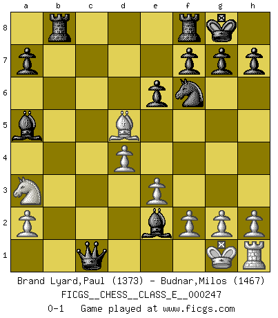 Last move : 0-1 2023 December 15 10:28:13 [Event "FICGS__CHESS__CLASS_E__000247"] [Site "FICGS"] [Date "2023.12.04"] [Round "1"] [White "Brand Lyard,Paul"] [Black "Budnar,Milos"] [Result "0-1"] [WhiteElo "1373"] [BlackElo "1467"] 1.d4 d5 2.Bf4 Bf5 3.e3 e6 4.Bb5+ c6 5.Ba4 Bb4+ 6.c3 Ba5 7.b4 Bb6 8.Bxb8 Rxb8 9.Na3 Nf6 10.b5 O-O 11.bxc6 bxc6 12.Bxc6 Ba5 13.Qd2 Qc7 14.Bxd5 Qxc3+ 15.Rc1 Qxd2+ 16.Kf1 Bd3 17.Ne2 Bxe2 18.Kg1 Qxc1 0-1 Follow this game move after move (download)I'm not a materialistic person, in that, I don't suffer the lack or loss of money. The absence of worldly goods I don't look back on. For Chess is a way I can be as materialistic as I want without having to sell my soul. (Jamie Walter Adams) Schach ist mein Leben, meine Leidenschaft, was ich gelernt habe und seit meinem 14. Lebensjahr profimässig praktiziere. Darauf zu verzichten, würde mir sehr schwer fallen. (Viktor Kortschnoi) Cuando tu no sabes absolutamente que mas hacer, es tiempo de entrar en pánico. (John van der Wiel) Les échecs c'est le défi de l'alpiniste, toujours plus haut, prêt à tout pour monter à l'assaut du Roi ennemi. Les échecs, c'est de la musique en mouvement, un ballet majestueux pour les yeux. C'est de la poésie composée par les fantômes du passé qui au même titre que Rimbaud ou Verlaine méritent notre admiration. Les échecs, c'est de la peinture ou le moindre mouvement modifie le tableau pour en faire un Picasso ou un Van Gogh. Les échecs, c'est tout et rien, c'est la vie et la mort. Jjulie33 sur le forum de France-Echecs. Home computers are being called upon to perform many new functions, including the consumption of homework formerly eaten by the dog. (Doug Larson)