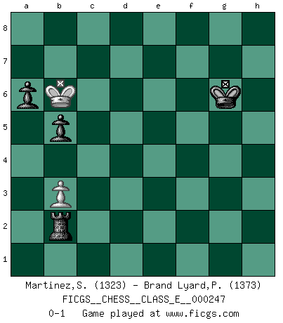 Last move : 0-1 2024 March 3 23:58:19 [Event "FICGS__CHESS__CLASS_E__000247"] [Site "FICGS"] [Date "2023.12.04"] [Round "1"] [White "Martinez,Silvio"] [Black "Brand Lyard,Paul"] [Result "0-1"] [WhiteElo "1323"] [BlackElo "1373"] 1.e4 e5 2.Nf3 Nc6 3.Nc3 d6 4.Bb5 Bg4 5.h3 Bxf3 6.Qxf3 Nf6 7.d3 Ng8 8.O-O Nf6 9.Nd5 a6 10.Ba4 Nxd5 11.exd5 b5 12.Bb3 Nd4 13.Qe4 Nxb3 14.cxb3 g5 15.d4 Bg7 16.Re1 O-O 17.Qg4 h6 18.dxe5 Bxe5 19.h4 Re8 20.Rb1 Bh2+ 21.Kf1 Rxe1+ 22.Kxe1 Qe8+ 23.Qe2 Qxe2+ 24.Kxe2 gxh4 25.Bxh6 Re8+ 26.Be3 Re4 27.Rc1 c5 28.Kd3 Rg4 29.Re1 Rxg2 30.Bh6 Rxf2 31.Re8+ Kh7 32.Bc1 Bf4 33.Bxf4 Rxf4 34.Rd8 h3 35.Rxd6 Rh4 36.Rf6 h2 37.Rxf7+ Kg6 38.Rf1 h1Q 39.Rxh1 Rxh1 40.d6 Rd1+ 41.Ke4 Rxd6 42.Ke5 Rd2 43.Ke4 Rxb2 44.Kd5 Rxa2 45.Kxc5 Rc2+ 46.Kb6 Rb2 0-1 Follow this game move after move (download)Nonsense was the last thing Fischer was interested in, as far as Chess was concerned. (Elie Agur) Sie führen leise Selbstgespräche, schlürfen lautstark ihre Getränke, schmatzen hörbar beim Essen, blasen ihrem Gegenüber Rauch in die Augen, niesen ihm ins Gesicht, starren ihn unverwandt an, bis er sich unter ihren Blicken windet, rutschen ständig auf ihrem Stuhl hin und her, rülpsen und bohren in der Nase. (Anonymous) La belleza de un movimiento no se refleja solo en su apariencia, sino en el pensamiento detrás de él. (Siegbert Tarrasch) Un journaliste : 'Vous préférez avoir une dame de plus sur l'échiquier ou au lit ?' Boris Spassky : 'Ca dépend de la position.' . 'gn is not allowed in chess unless n is an integer between 1 and 8 inclusive, where 1 and 8 are to interpreted as the standard numerals standing for integers in the ordered real-closed field R, with the *canonical* ordering. (As opposed to, say, an integer in the domain Z[2+i*sqrt(5)] or an integer in some exotic Grothendieck topos). (Normajean Yates)