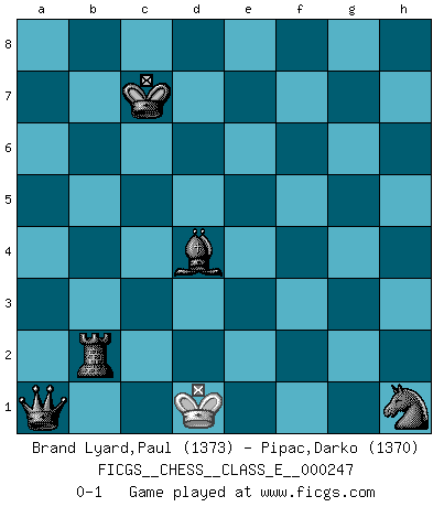 Last move : 0-1 2023 December 20 19:59:31 [Event "FICGS__CHESS__CLASS_E__000247"] [Site "FICGS"] [Date "2023.12.04"] [Round "1"] [White "Brand Lyard,Paul"] [Black "Pipac,Darko"] [Result "0-1"] [WhiteElo "1373"] [BlackElo "1370"] 1.d4 d5 2.Nc3 Nc6 3.e4 dxe4 4.Nxe4 Qxd4 5.Qxd4 Nxd4 6.Kd1 Bf5 7.Bd3 Bxe4 8.Bxe4 O-O-O 9.Bd2 e5 10.Ke1 f5 11.Bxb7+ Kxb7 12.Rc1 Nf6 13.Bg5 h6 14.Bxf6 gxf6 15.Kf1 f4 16.Rd1 Bc5 17.c3 Nf5 18.Rxd8 Rxd8 19.Ke2 Nh4 20.g4 f5 21.h3 e4 22.gxf5 Nxf5 23.b4 f3+ 24.Nxf3 exf3+ 25.Ke1 Re8+ 26.Kd2 Bxf2 27.h4 Re2+ 28.Kd3 Bxh4 29.Rf1 Ng3 30.Rxf3 Rxa2 31.Rf7 h5 32.Rf4 Be7 33.Rf7 Bd6 34.Rf3 h4 35.b5 h3 36.Rf6 h2 37.Rh6 h1Q 38.Rxh1 Nxh1 39.c4 Ra3+ 40.Kd4 Kb6 41.c5+ Bxc5+ 42.Kc4 c6 43.bxc6 Ra4+ 44.Kb3 Rb4+ 45.Kc3 a5 46.Kc2 a4 47.c7 Kxc7 48.Kc1 Bd4 49.Kc2 Rb3 50.Kc1 Rb2 51.Kd1 a3 52.Kc1 a2 53.Kd1 a1Q+ 0-1 Follow this game move after move (download)Bobby Fischer is the greatest Chess genius of all time ! (Alexander Kotov) Es ist besser die Steine des Gegners zu opfern. (Savielly Grigorievitsch Tartakower) Las combinaciones han sido siempre el aspecto más intrigante del Ajedrez. Los Maestros las buscan, el público las aplauden, los críticos las alaban. La razón se debe a que las combinaciones hacen posible que el Ajedrez sea más que un ejercicio matemático con una carencia de vida. Ellas son la poesía del juego, son del Ajedrez lo que la melodía es de la música. Ellas representan el triunfo de la mente sobre la materia. (Reuben Fine) Les Echecs représentent une sphère d'idées créatrices basée sur la volonté des deux protagonistes. (Smyslov) Lottery : A tax on people who are bad at math. (Author unknown)
