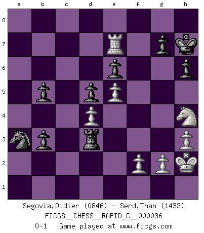Last move : 0-1 2007 October 22 2:29:58 [Event "FICGS__CHESS__RAPID_C__000036"] [Site "FICGS"] [Date "2007.09.10"] [Round "1"] [White "Segovia,Didier"] [Black "Serd,Than"] [Result "0-1"] [WhiteElo "0846"] [BlackElo "1432"] 1.e4 c6 2.d4 d5 3.e5 Bf5 4.c4 e6 5.Be2 Nd7 6.c5 b5 7.Nf3 a5 8.O-O Ne7 9.b3 Ng6 10.Nc3 Be7 11.Bd2 Qc7 12.a3 Qb7 13.h3 Ngf8 14.Bg5 Bxg5 15.Nxg5 h6 16.Nf3 Bh7 17.Bd3 Bxd3 18.Qxd3 Ng6 19.Rfb1 O-O 20.Re1 b4 21.axb4 axb4 22.Rxa8 Rxa8 23.Na4 Ngf8 24.Nh4 Qb5 25.Qxb5 cxb5 26.Nb6 Nxb6 27.cxb6 Nd7 28.Rc1 Nxb6 29.Rc5 Ra5 30.Rc6 Nc4 31.Nf3 Ra1+ 32.Kh2 Na3 33.Rc8+ Kh7 34.Nh4 Rb1 35.Rf8 Rxb3 36.Rxf7 Rd3 37.Re7 b3 0-1 Caro-Kann : Advance variation Kingside Castling by player White (move 8) Kingside Castling by player Black (move 19) Player Black won this chess game. Follow this game move after move (download)Fischer sacrificed virtually everything most of us weakies (to use his term) value, respect, and cherish, for the sake of an artful, often beautiful board game, for the ambivalent privilege of being its greatest master. (Paul Kollar) Der Bart als Geschlechtszeichen mitten im Gesicht ist obszön. Daher gefällt er den Weibern. [Zugegeben, kein Schachzitat, aber unglaublich originell] (Arthur Schopenhauer) Con el tiempo, empecé a progresar en partidas decisivas. Tal vez porque me di cuenta de una simple verdad: no solo estaba yo nervioso sino también mi oponente. (Mikhail Tal) Avec des compensations pour le matériel en plus... (Anonyme) He who is a good ruler must first have been ruled. (Aristotle)